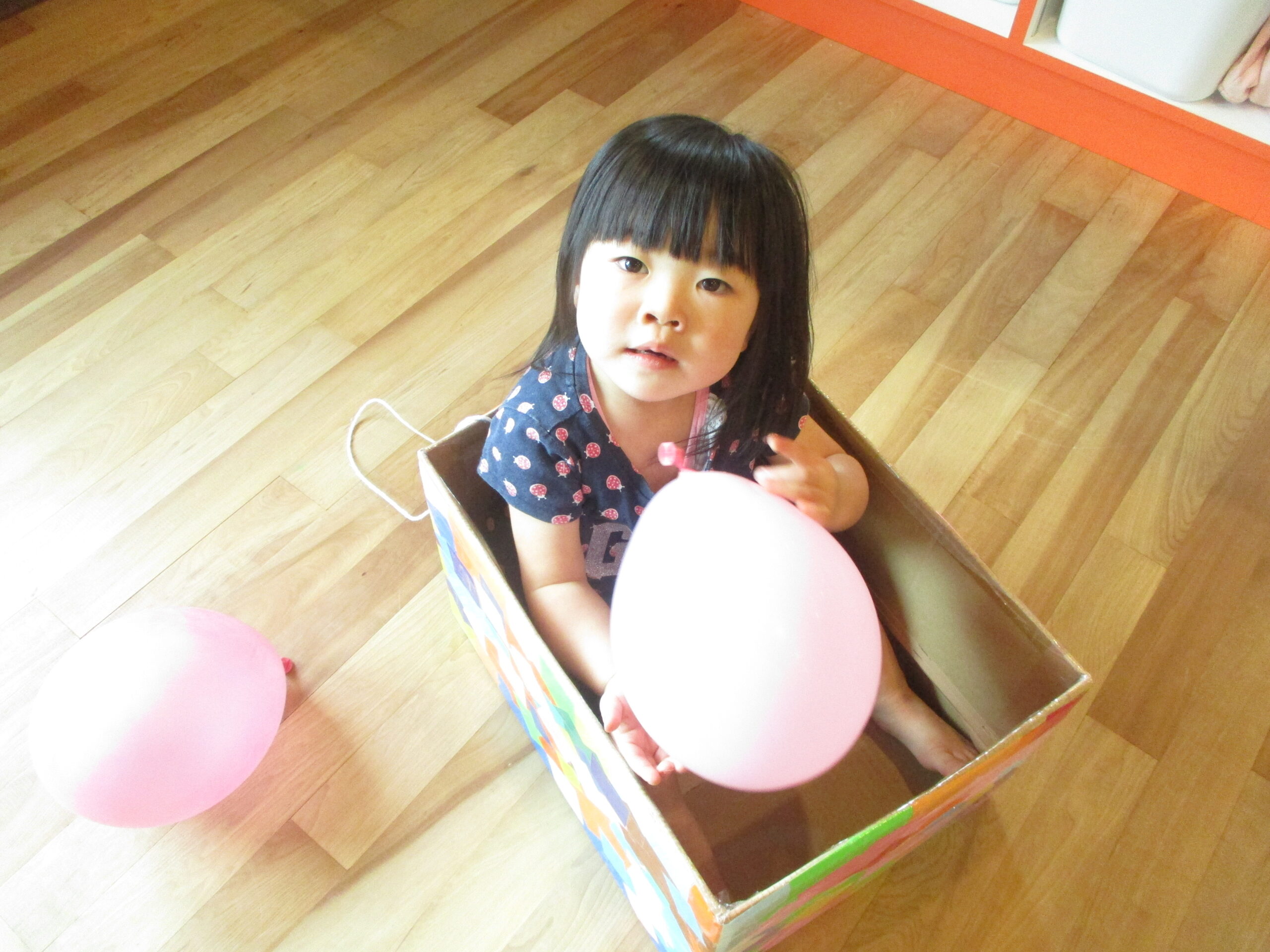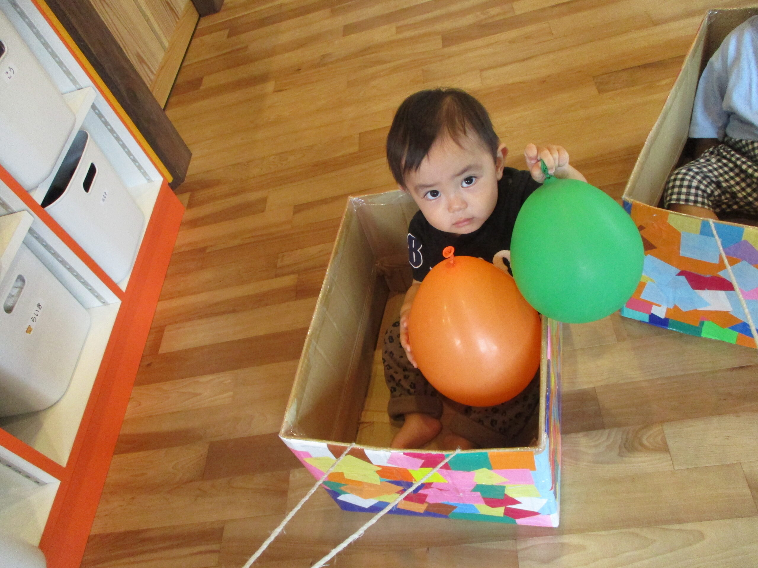 どんぐり組さんとくり組さんで一緒に風船遊びをしました。段ボールの中に風船を乗せて引っ張るとニコッと笑っていた子ども達でした。