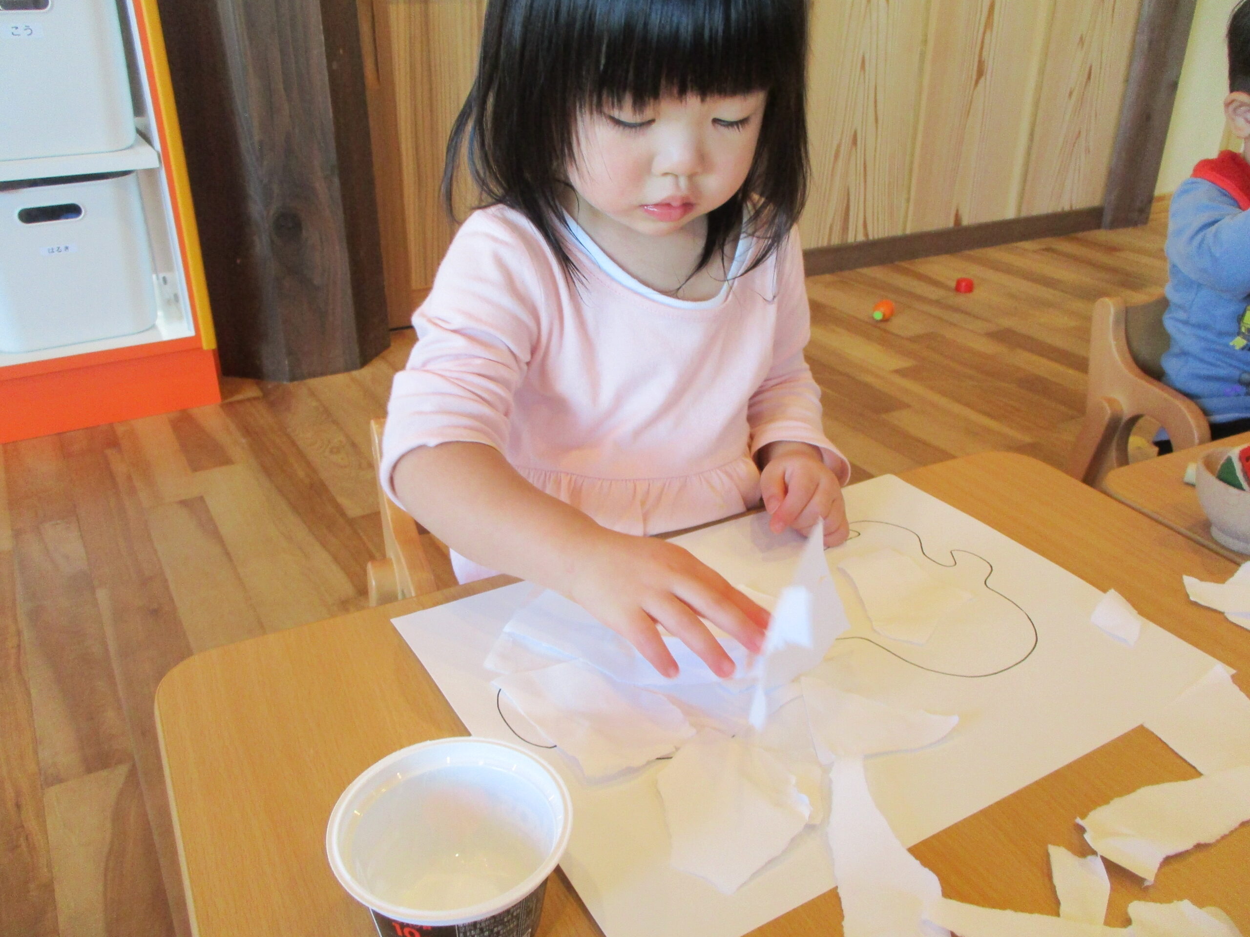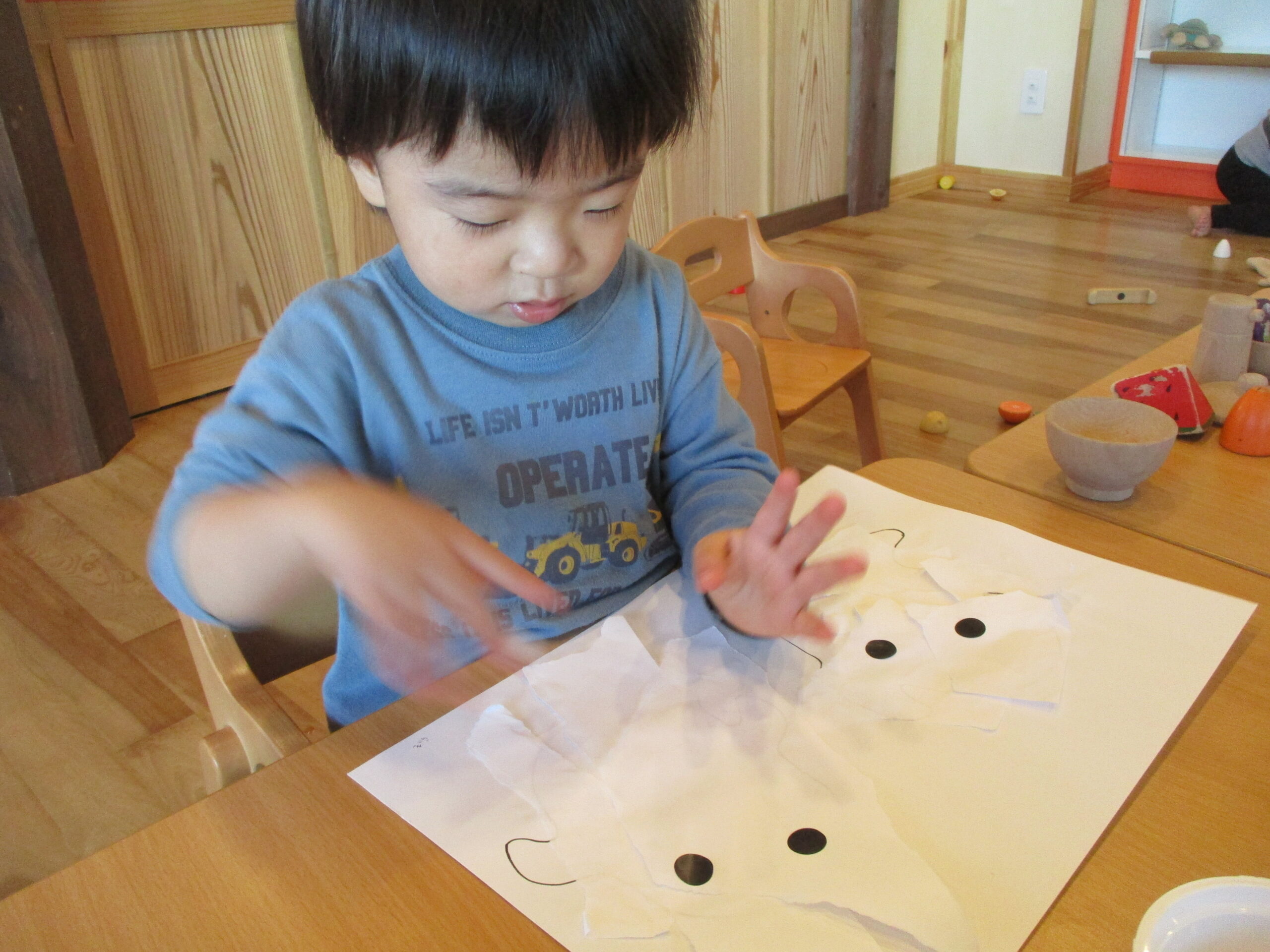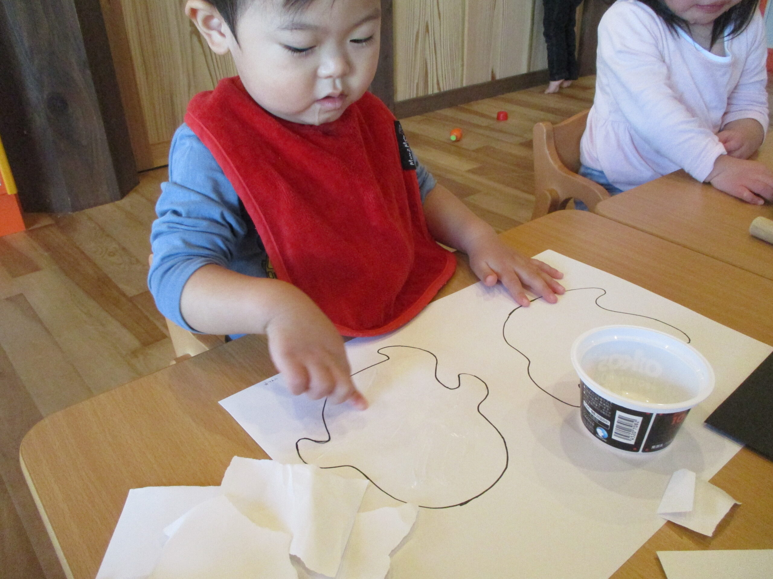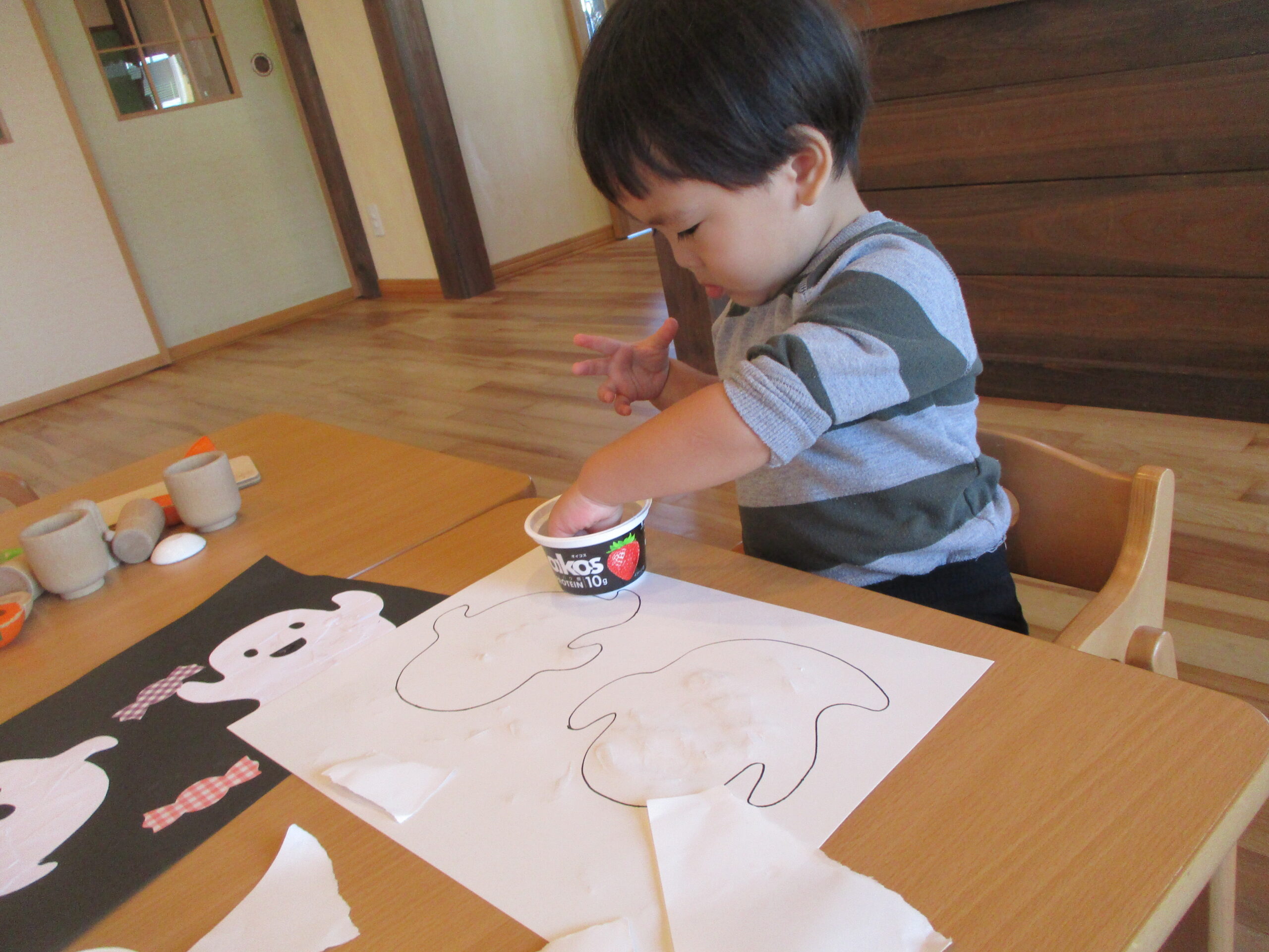 紙をちぎって、のりを付けて、みんなでお化けを作りました。