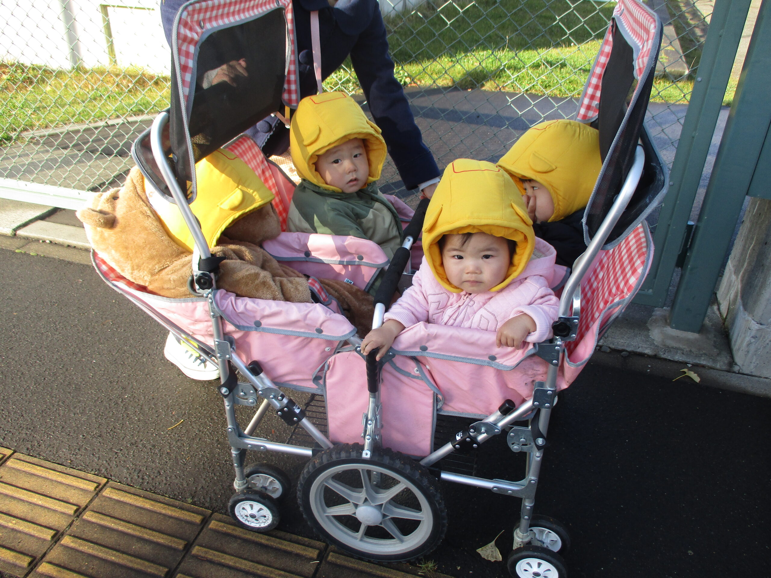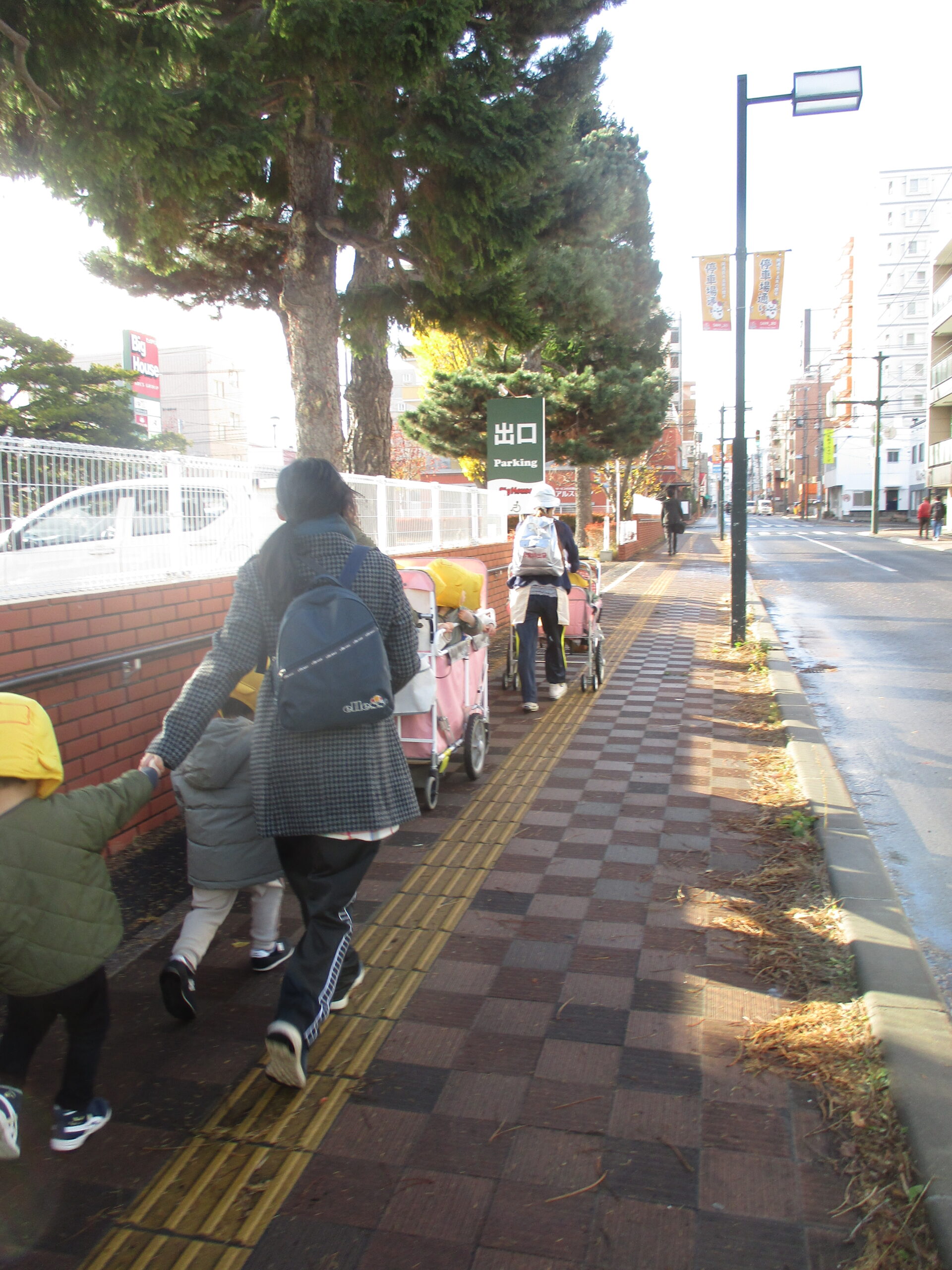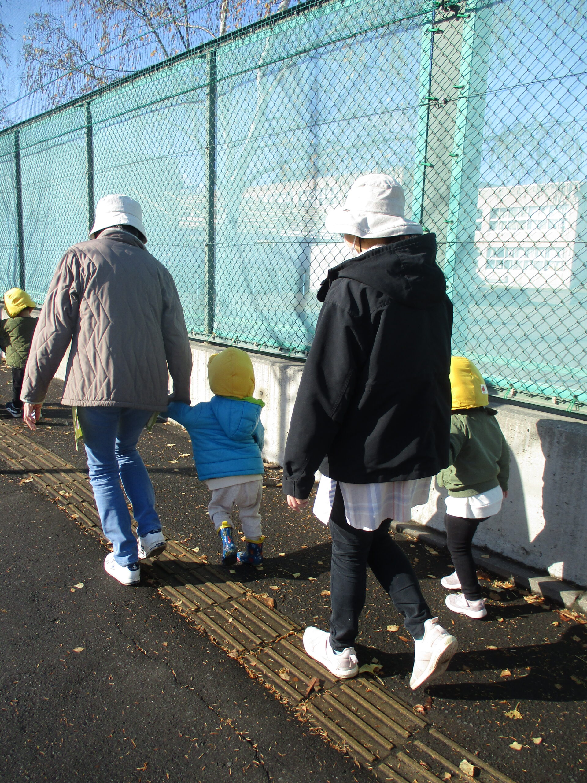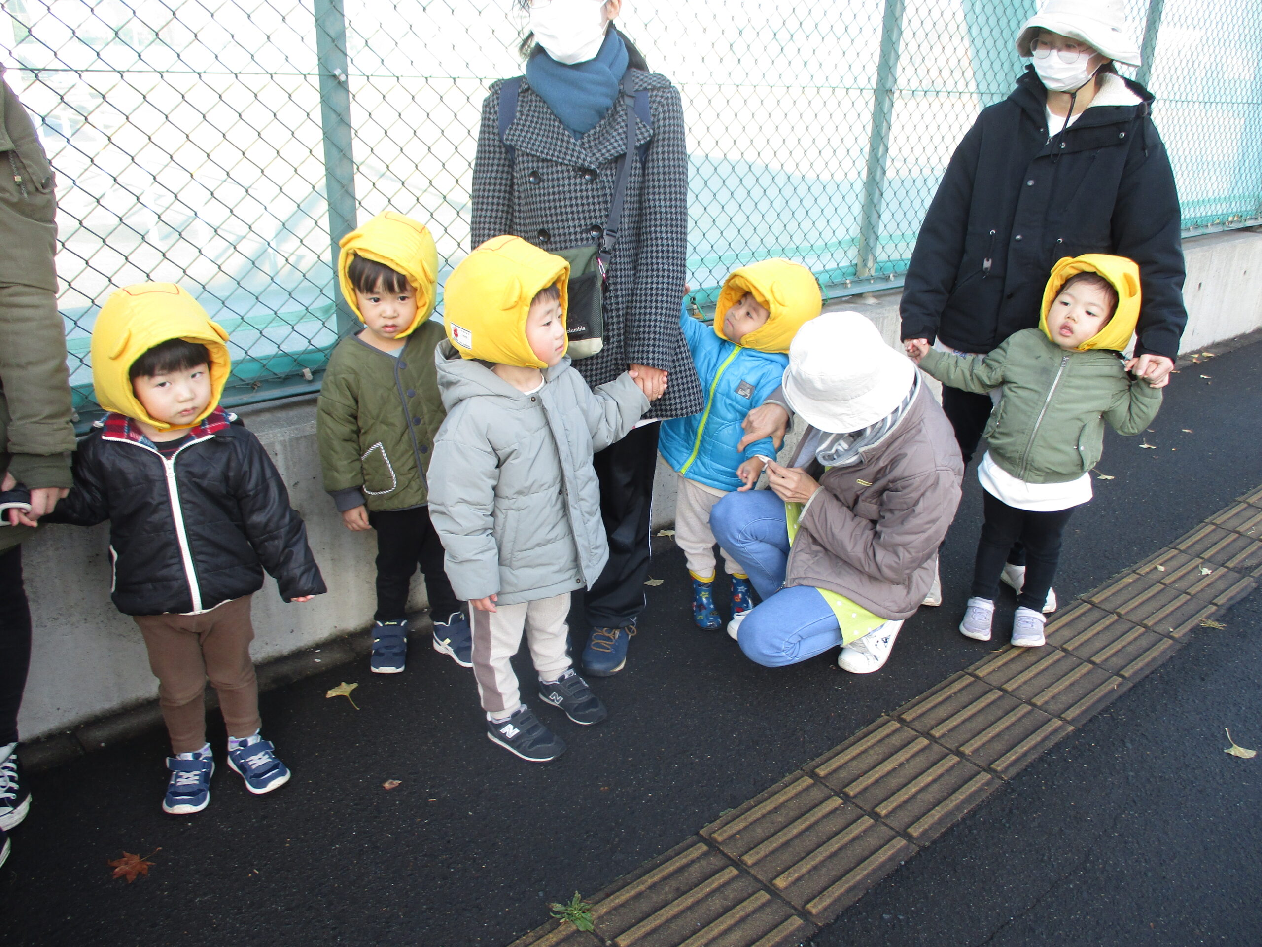 今日は、11月の避難訓練を行いました。 大きな地震が来たという設定で、第2次避難場所の「白石小学校」へ向かいました。 子ども達には少し遠い場所でしたが、お天気も味方して、2歳児さんはしっかりと 小学校まで歩けました。 車の多い通りでしたが、「端っこを歩く」「赤は止まれ」等教えてもらった事を 口にしながら、上手に道を歩いていて、成長を感じました。 防災頭巾にも慣れて、しっかりとかぶれました。 いざという時の練習は、ホントに大切だと思いますね。