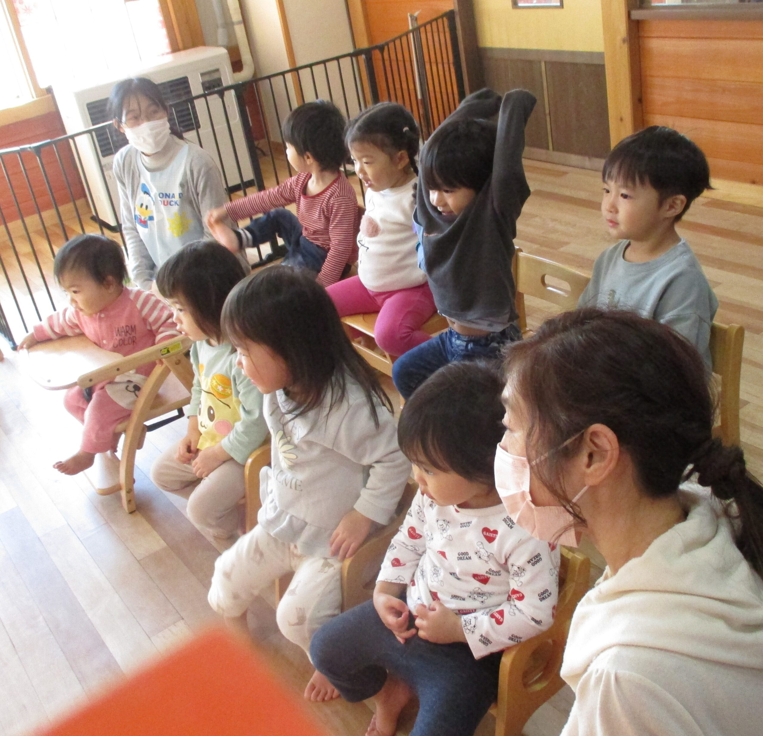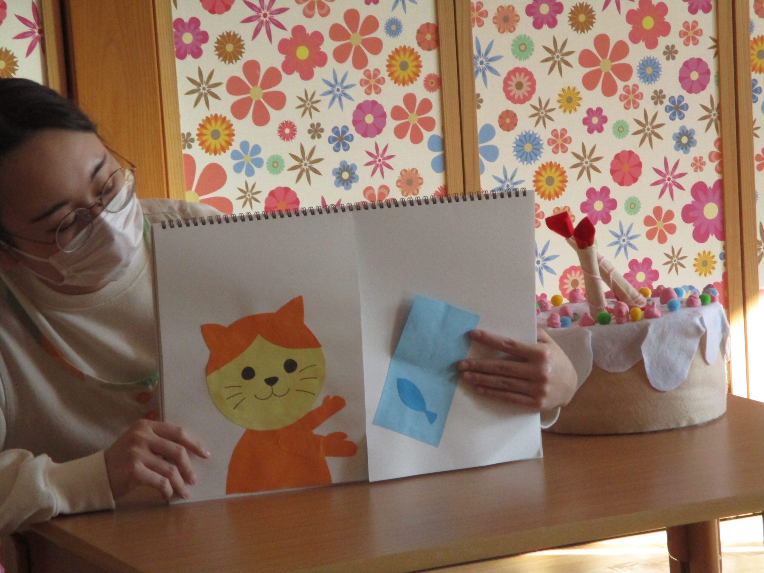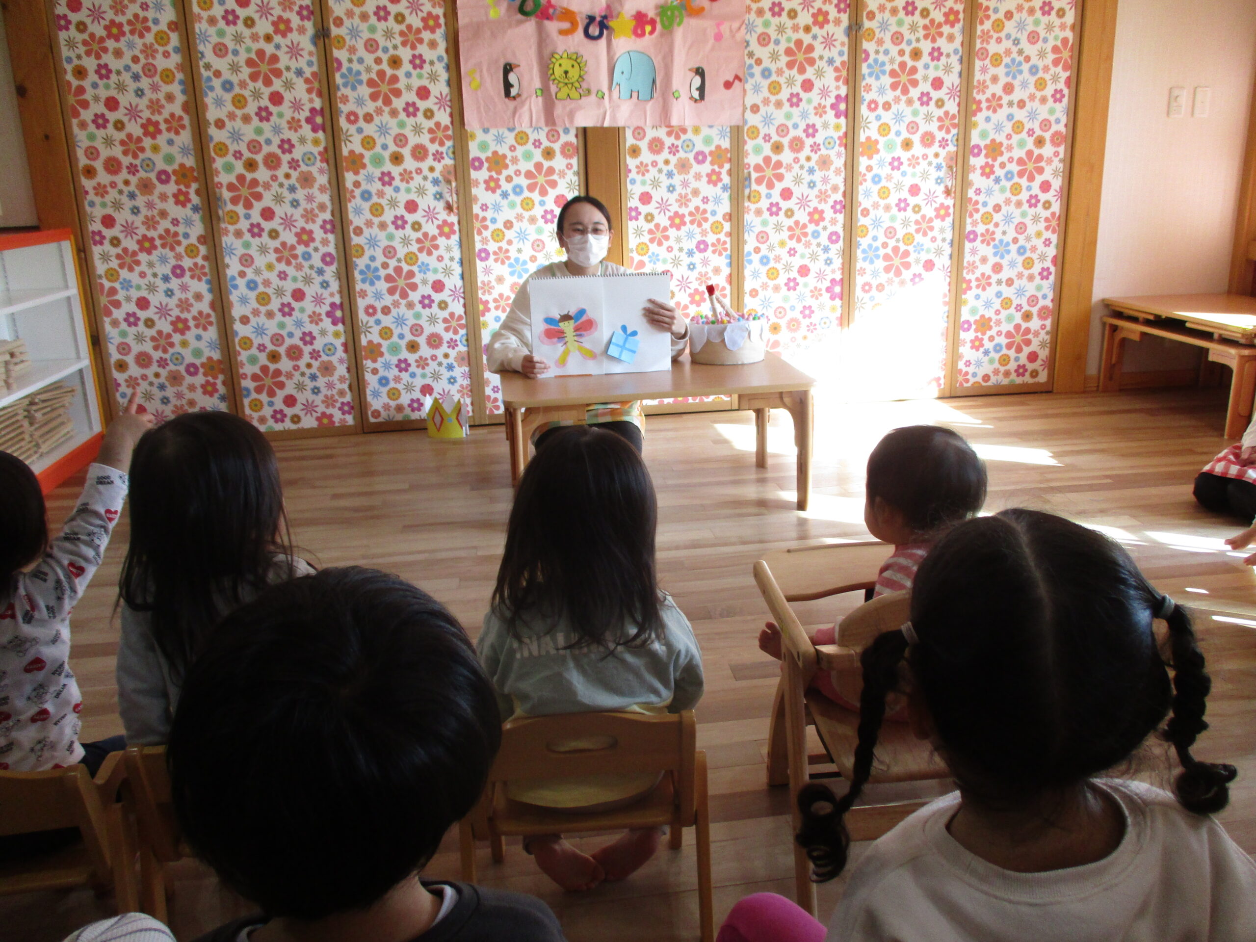 昨日、11月のお誕生日会を行いました。 お友達の前に出る事に緊張していましたが、みんなの歌に、思わずにっこりでした。 ろうそく「ふーっ!」もドキドキしながら見せてくれましたよ。 今回は、みんなでスケッチブックシアターを見ました。 プレゼントの中に何が入っているか、みんなで考えて盛り上がりました。 かわいい動物さんと、素敵なプレゼントに笑顔のいっぱいな子ども達でした。