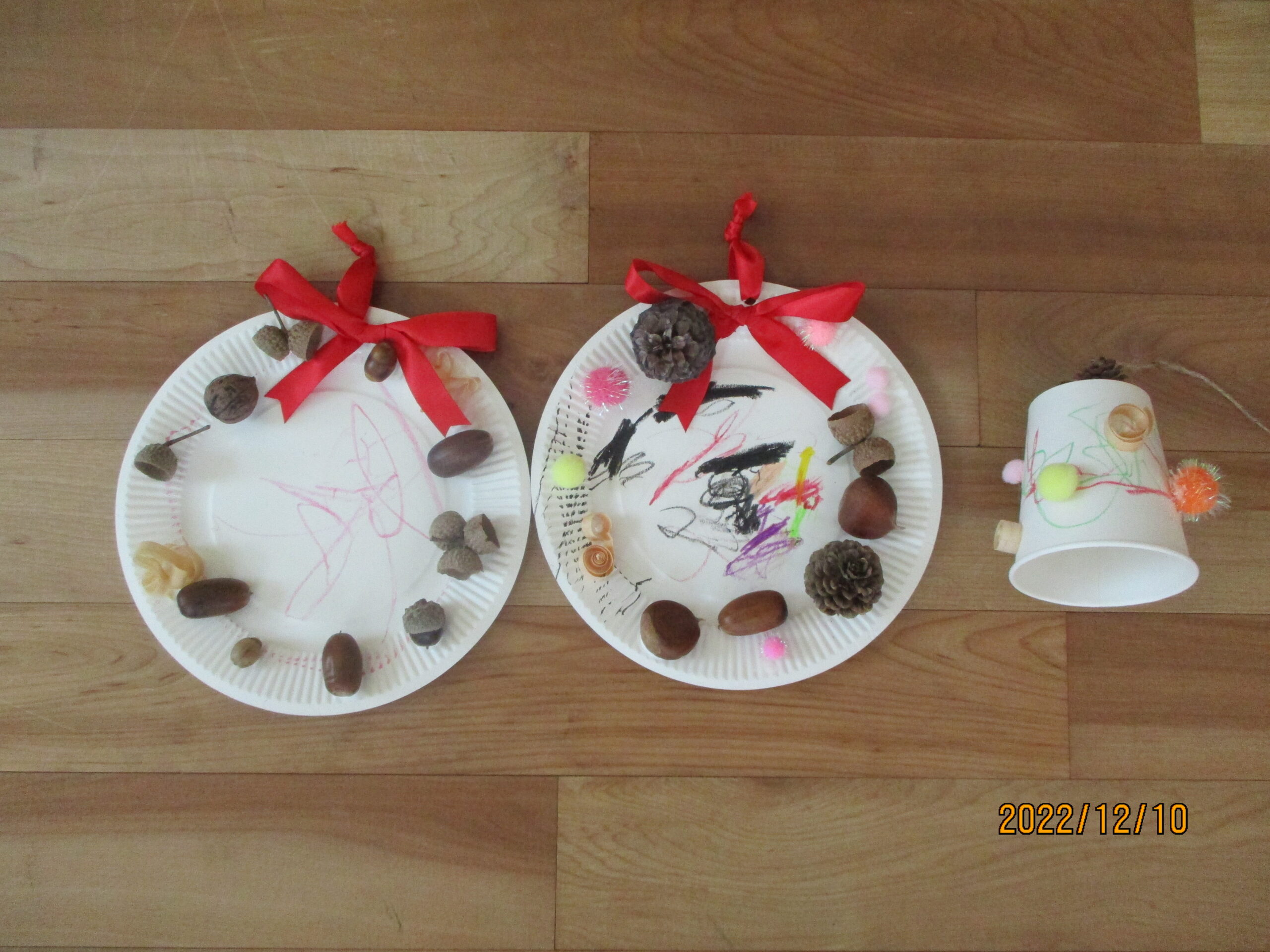 まだまだ作り足りなくて、紙皿のリースと紙コップの鐘も作りましたよ。
