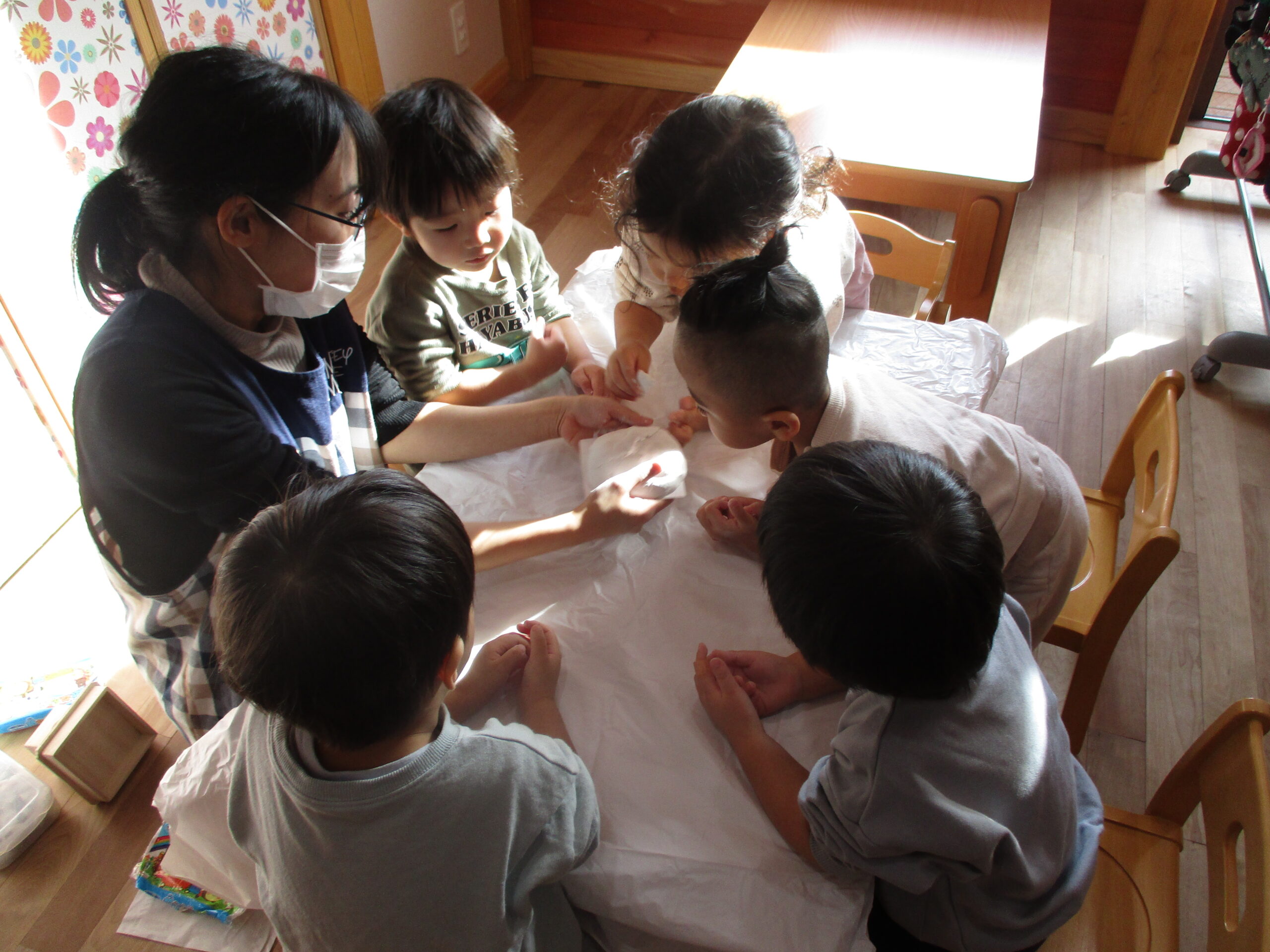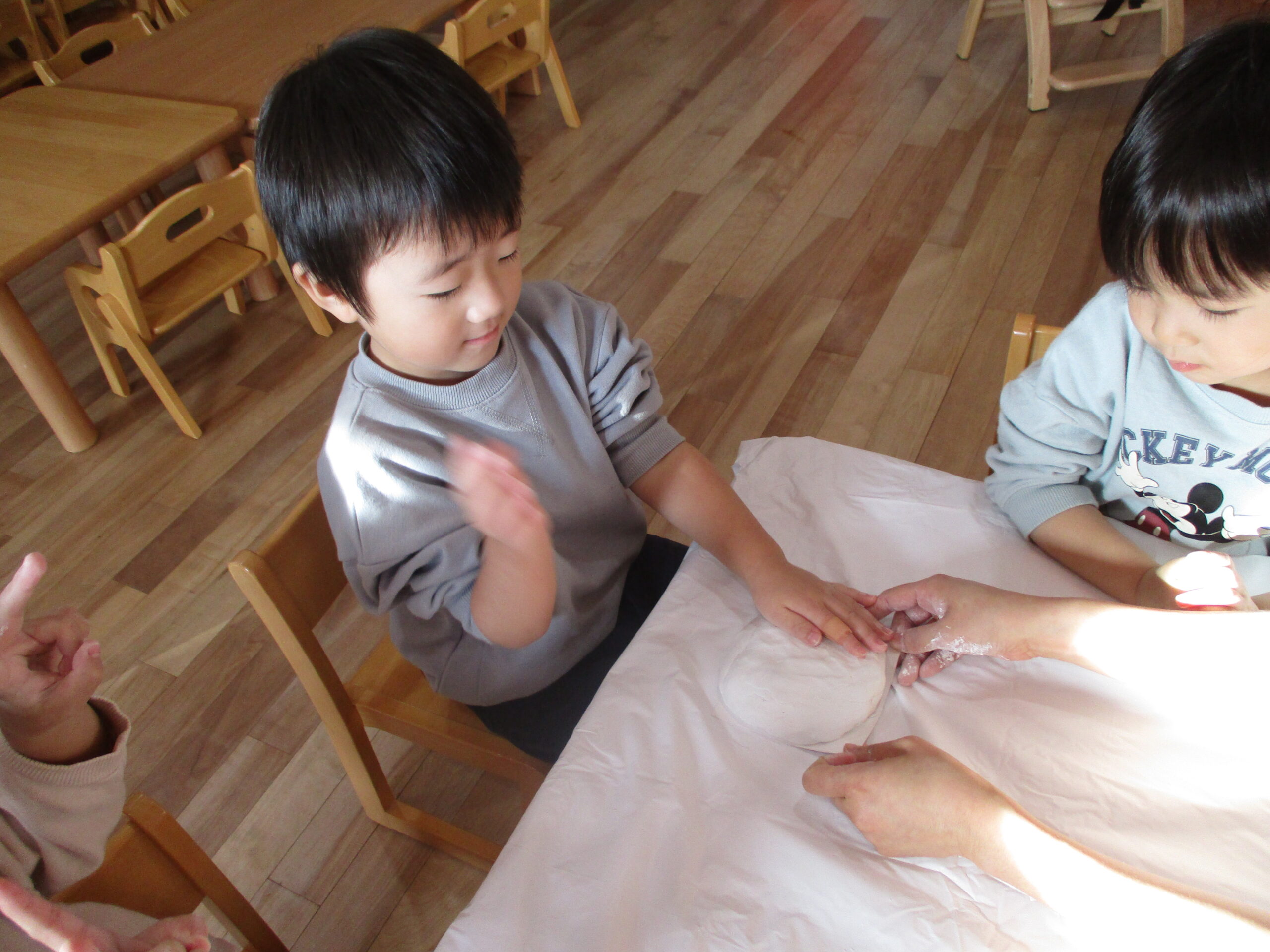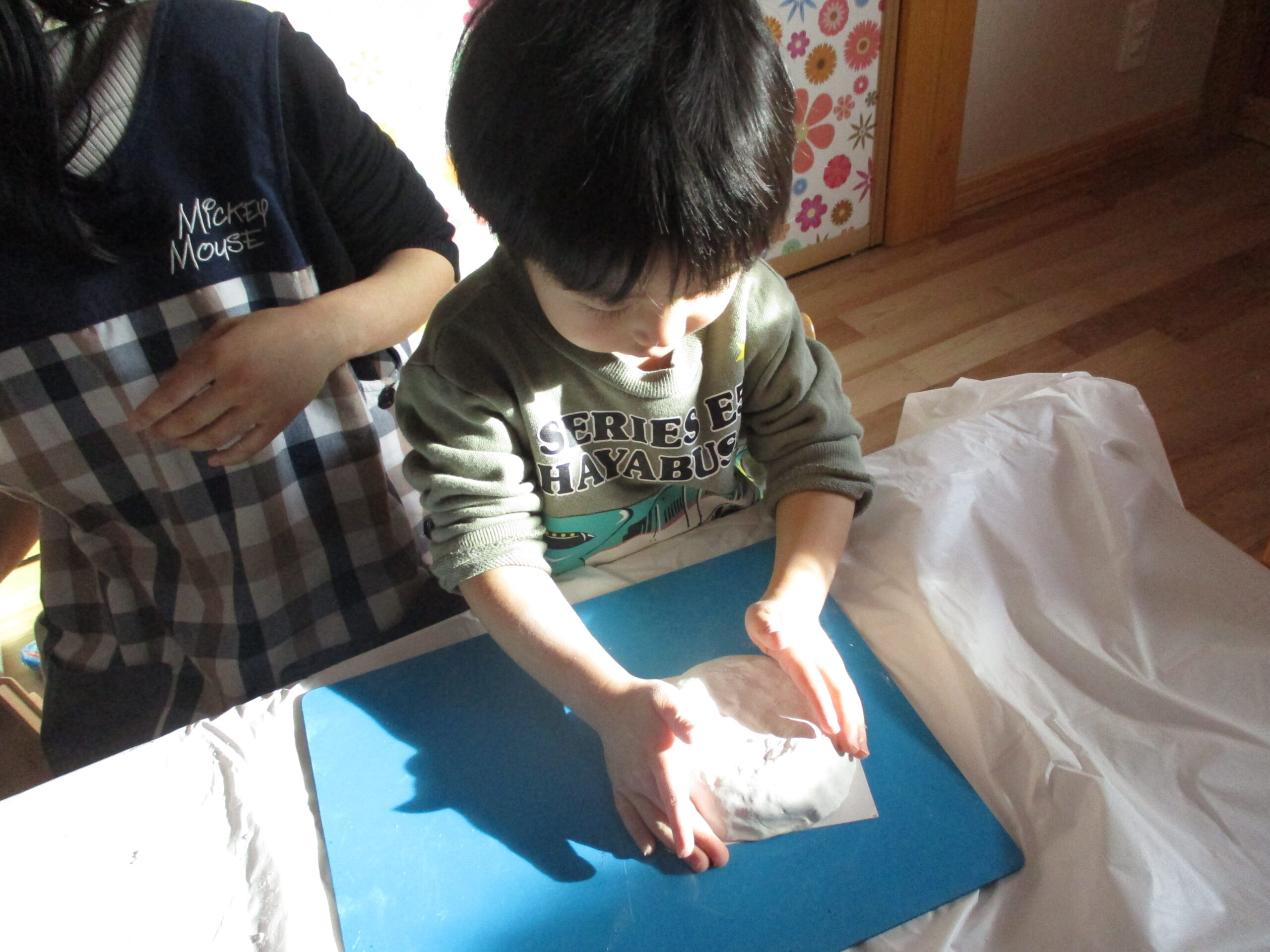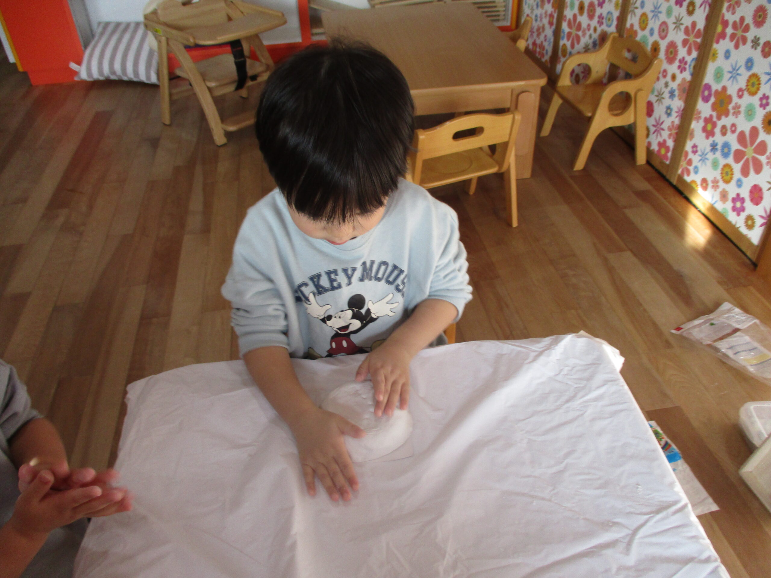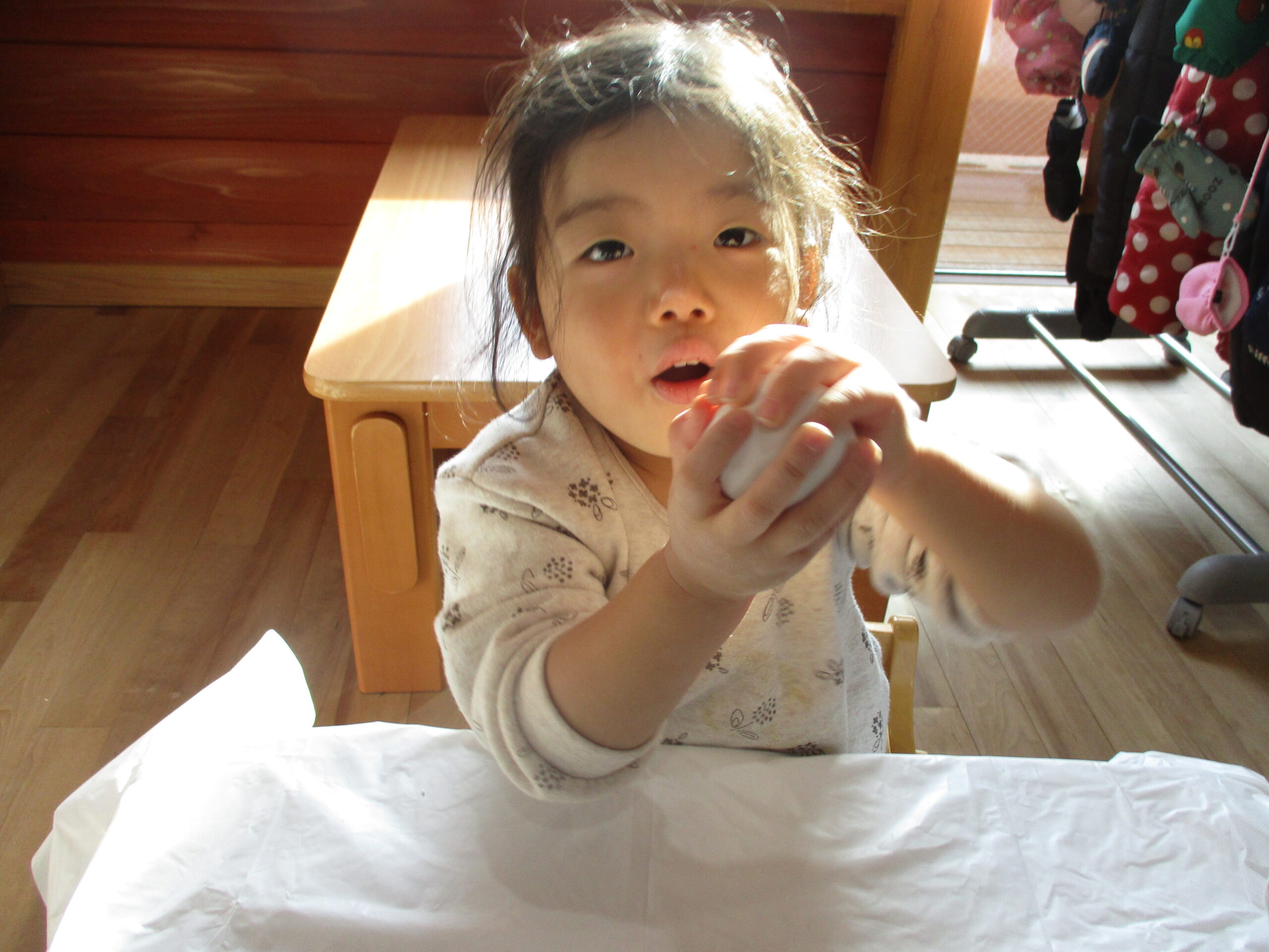 そこで2歳児さんにお願いをして、かがみもちを作ってもらう事にしました!