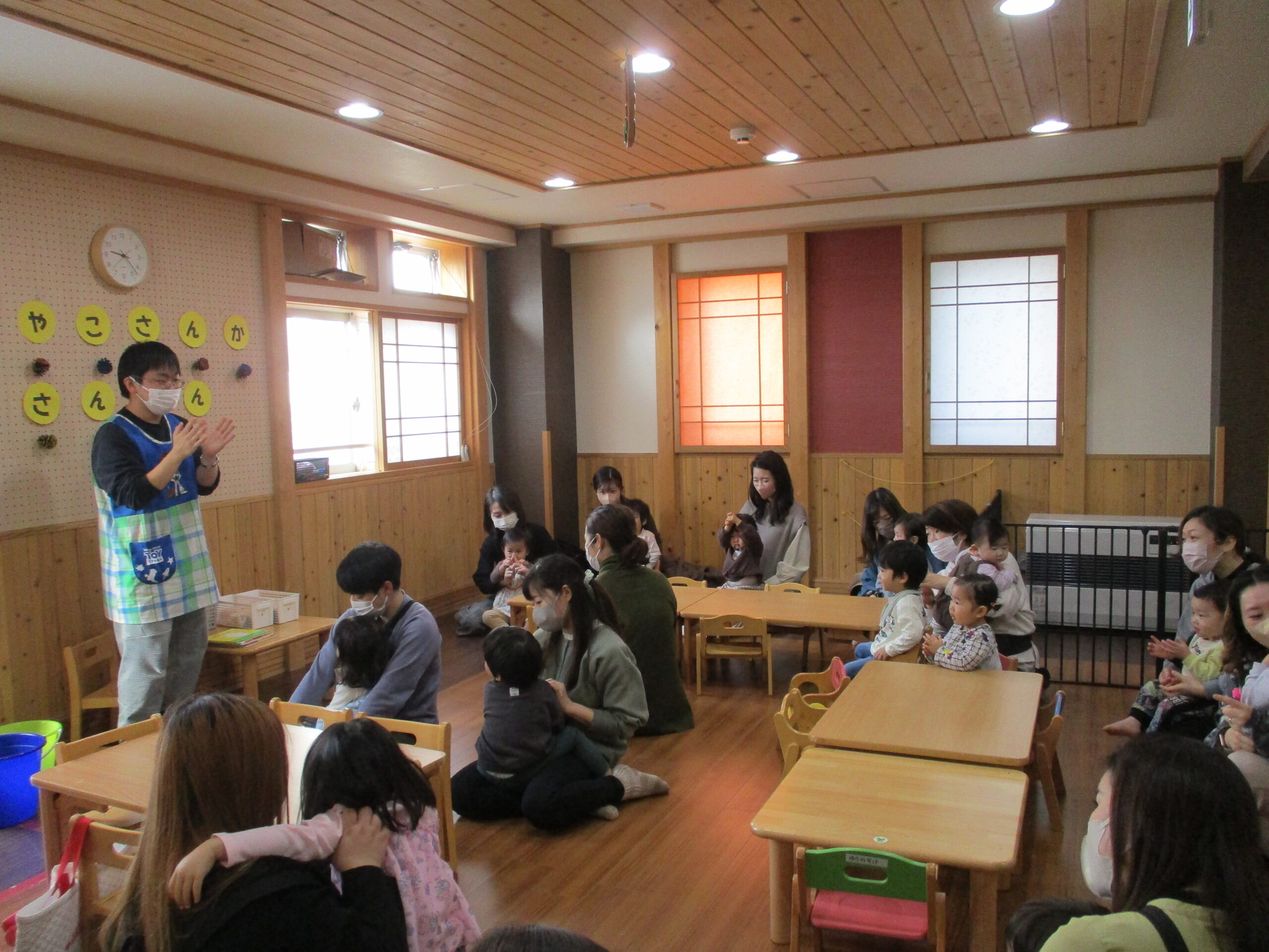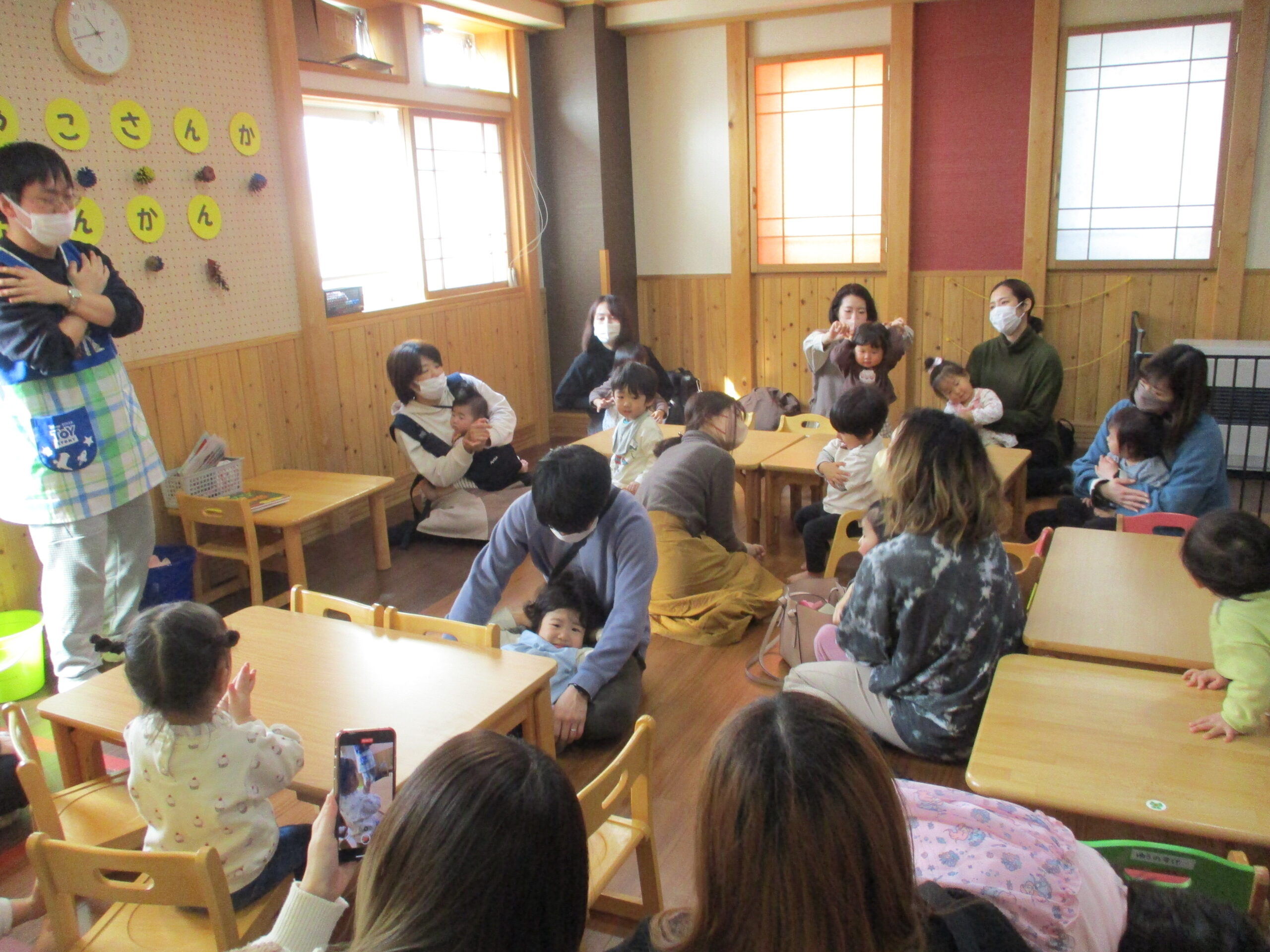 小春を思わせる暖かい日、<br /> 新川園のお友だちがお父さん、お母さんと一緒に登園しました。<br /> まずは朝の会。いつもと違って少し緊張気味のお友だち・・
