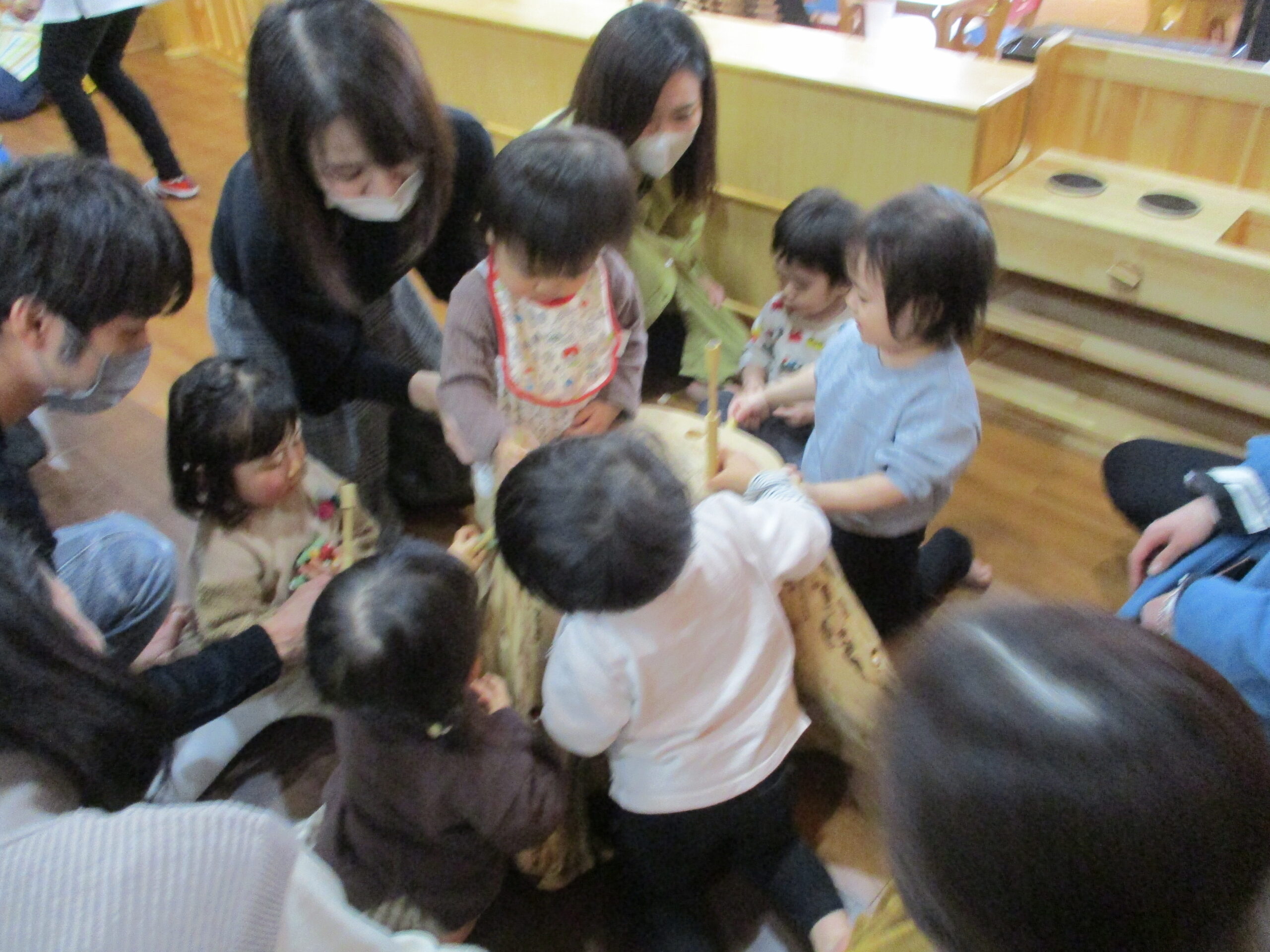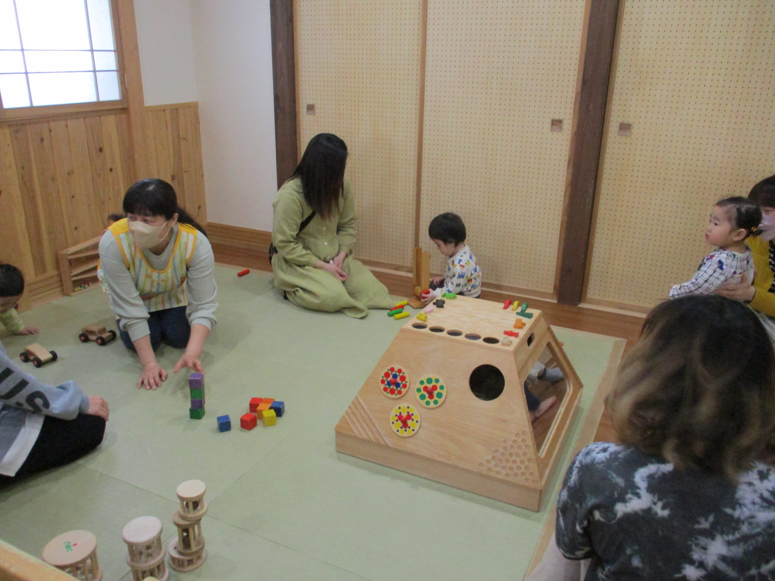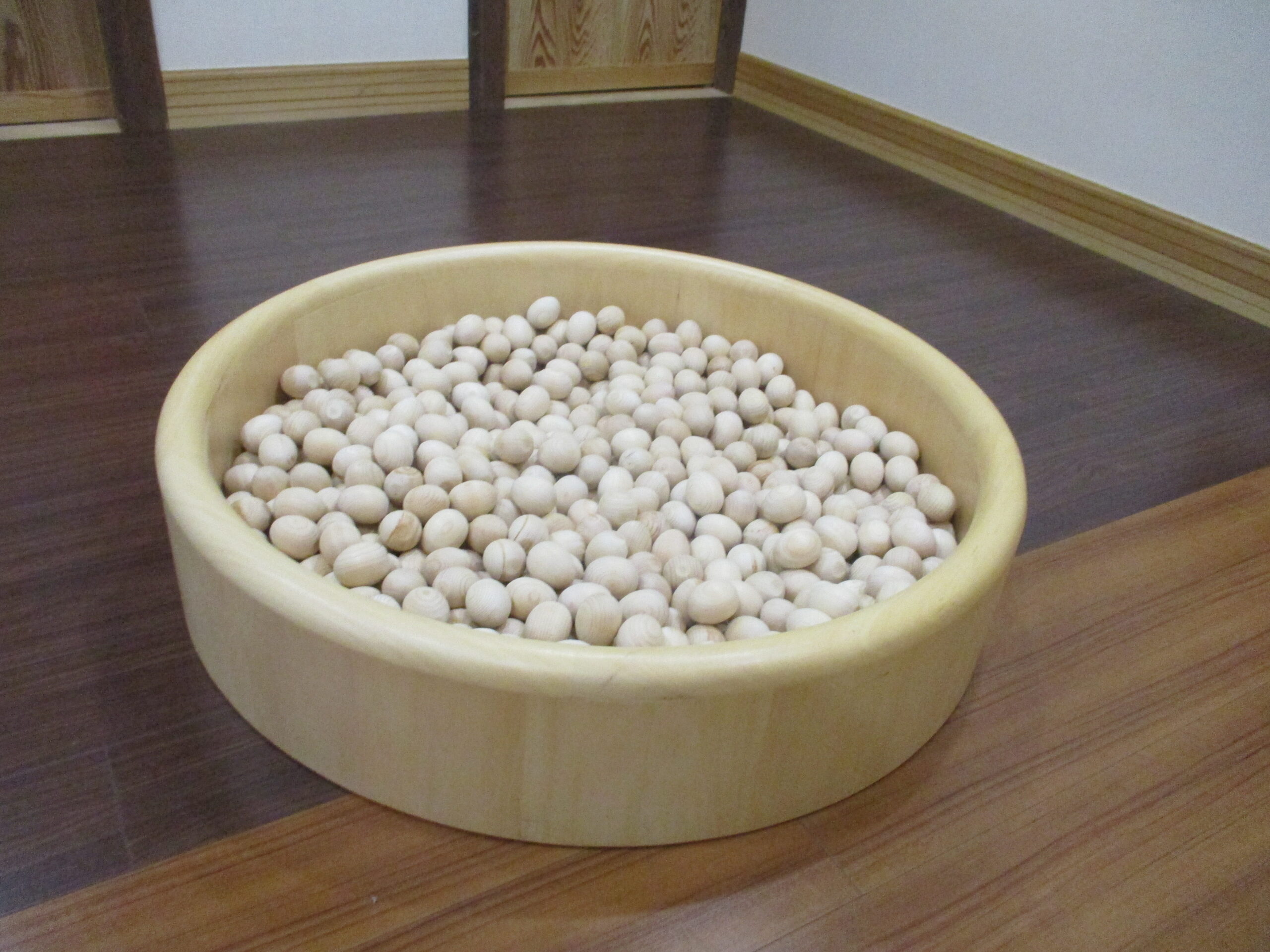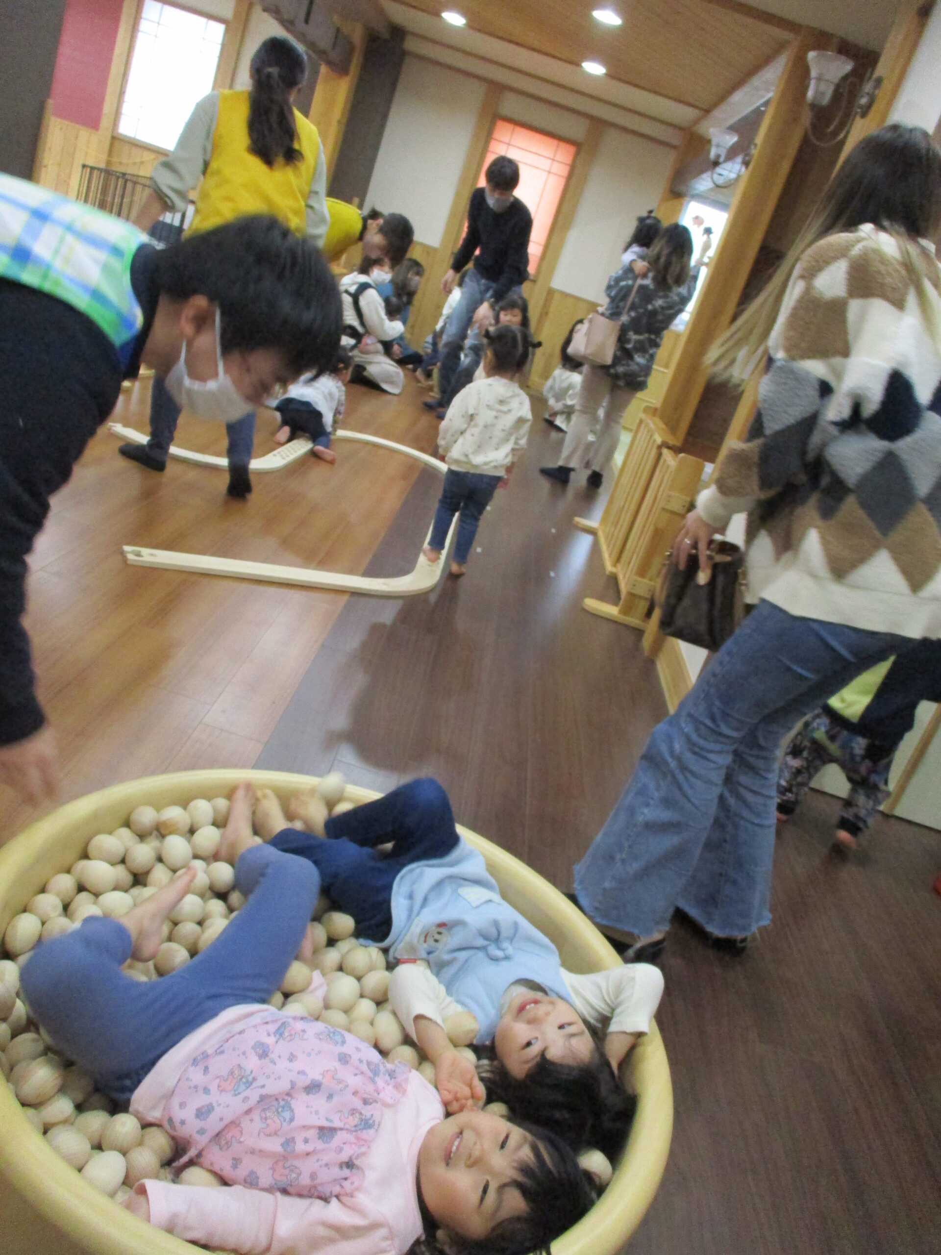 お茶を飲んで絵本を見た後は、みんなで一緒に遊びます。<br /> 木の玉プール。<br /> ヒノキの香りに癒されてます・・😊