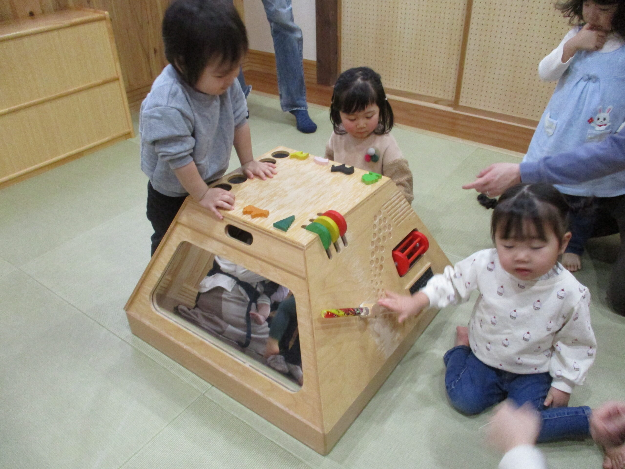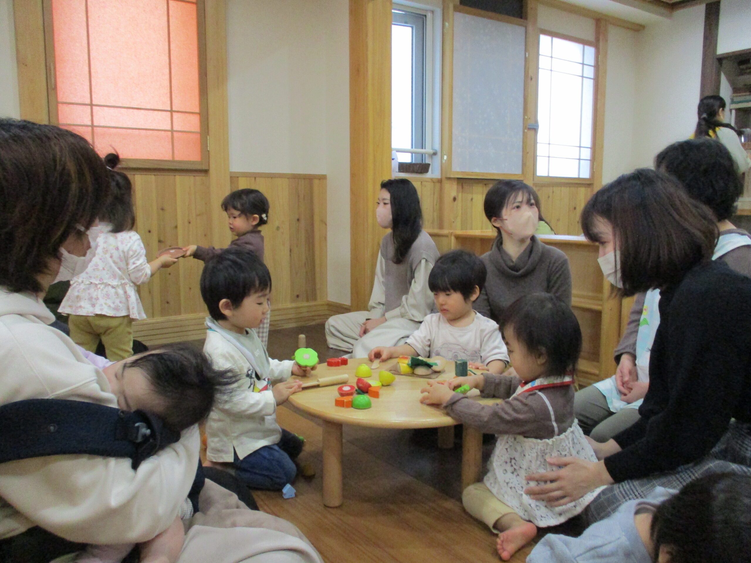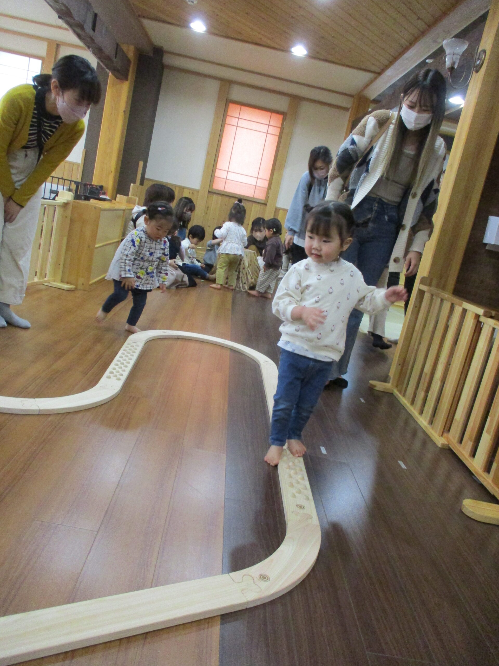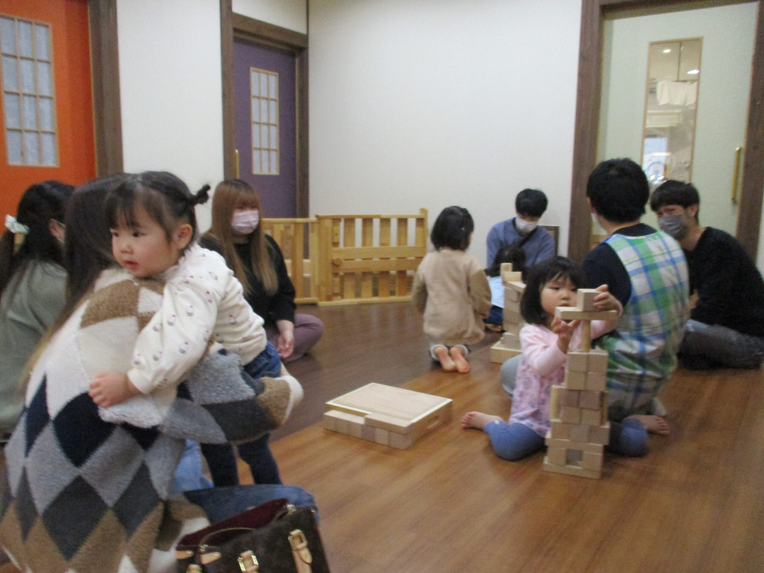 お茶を飲んで絵本を見た後は、みんなで一緒に遊びます。<br /> 木の玉プール。<br /> ヒノキの香りに癒されてます・・😊
