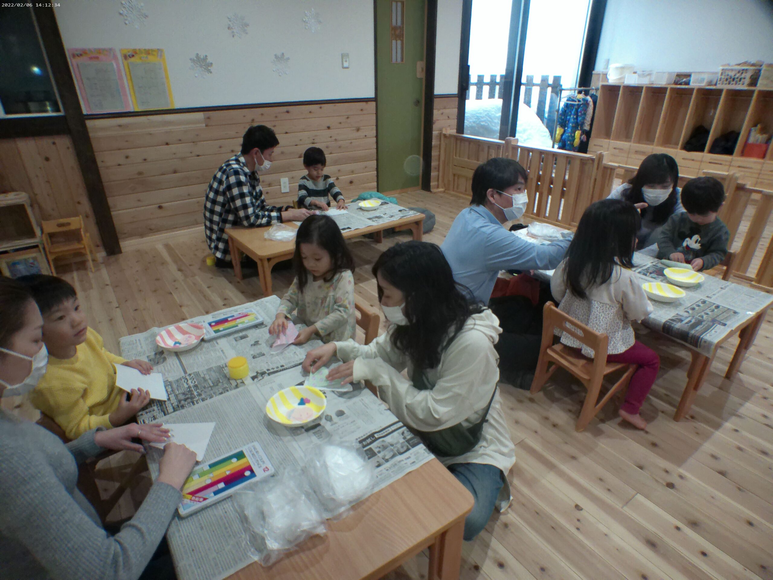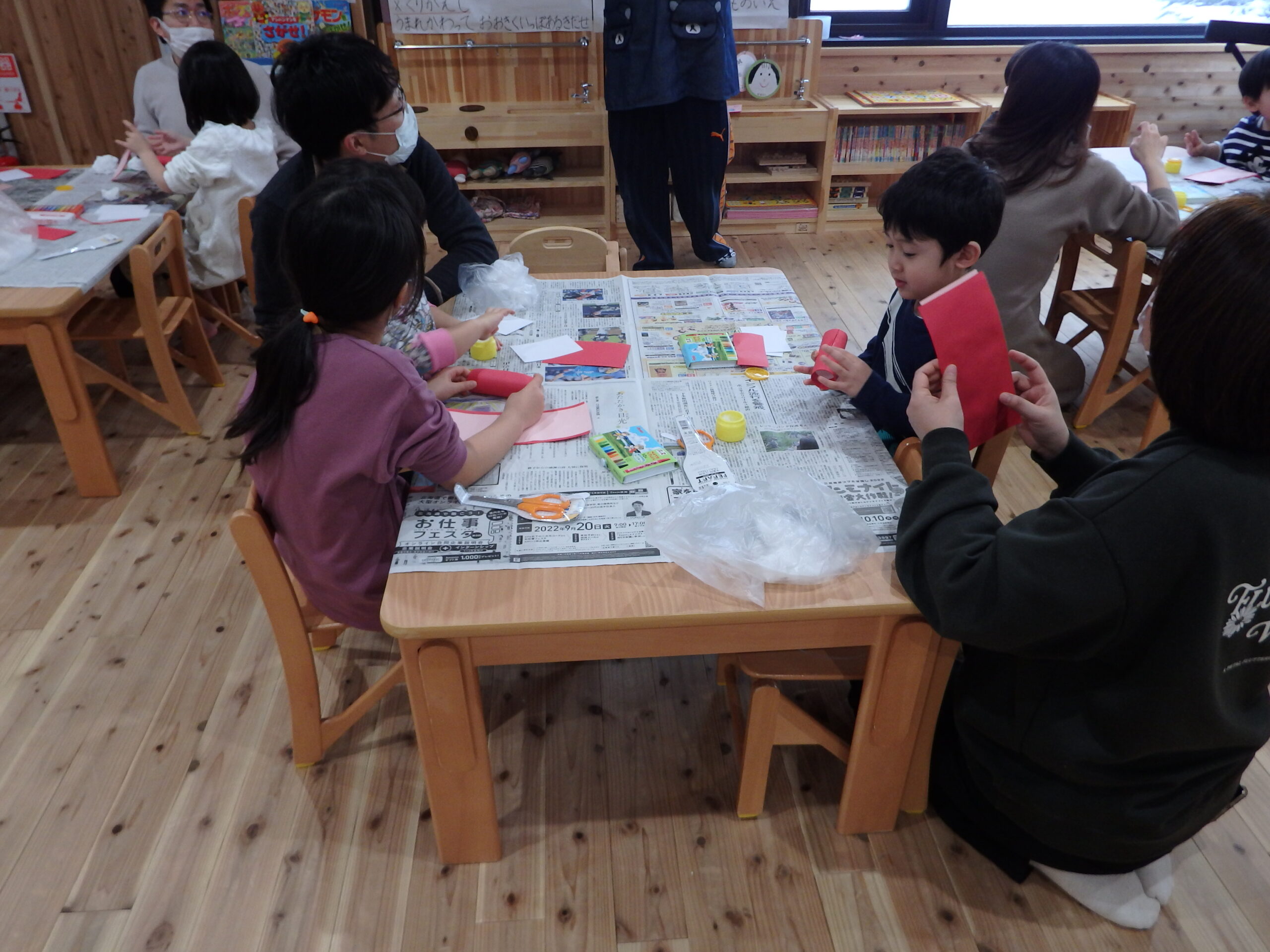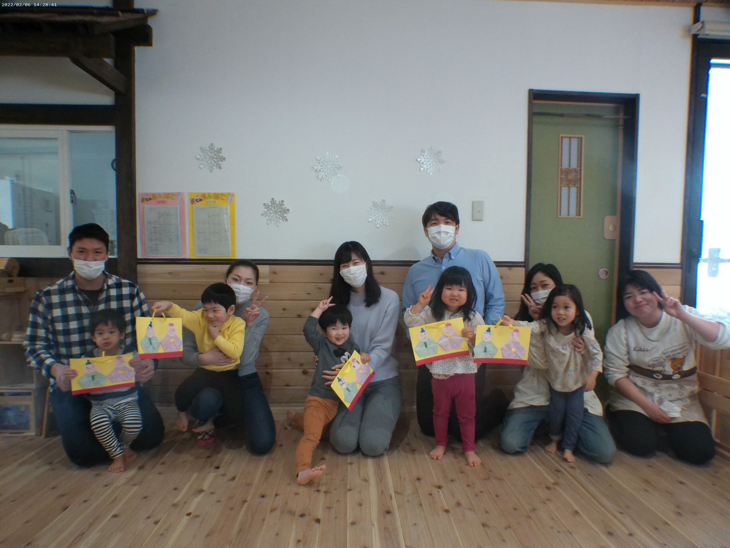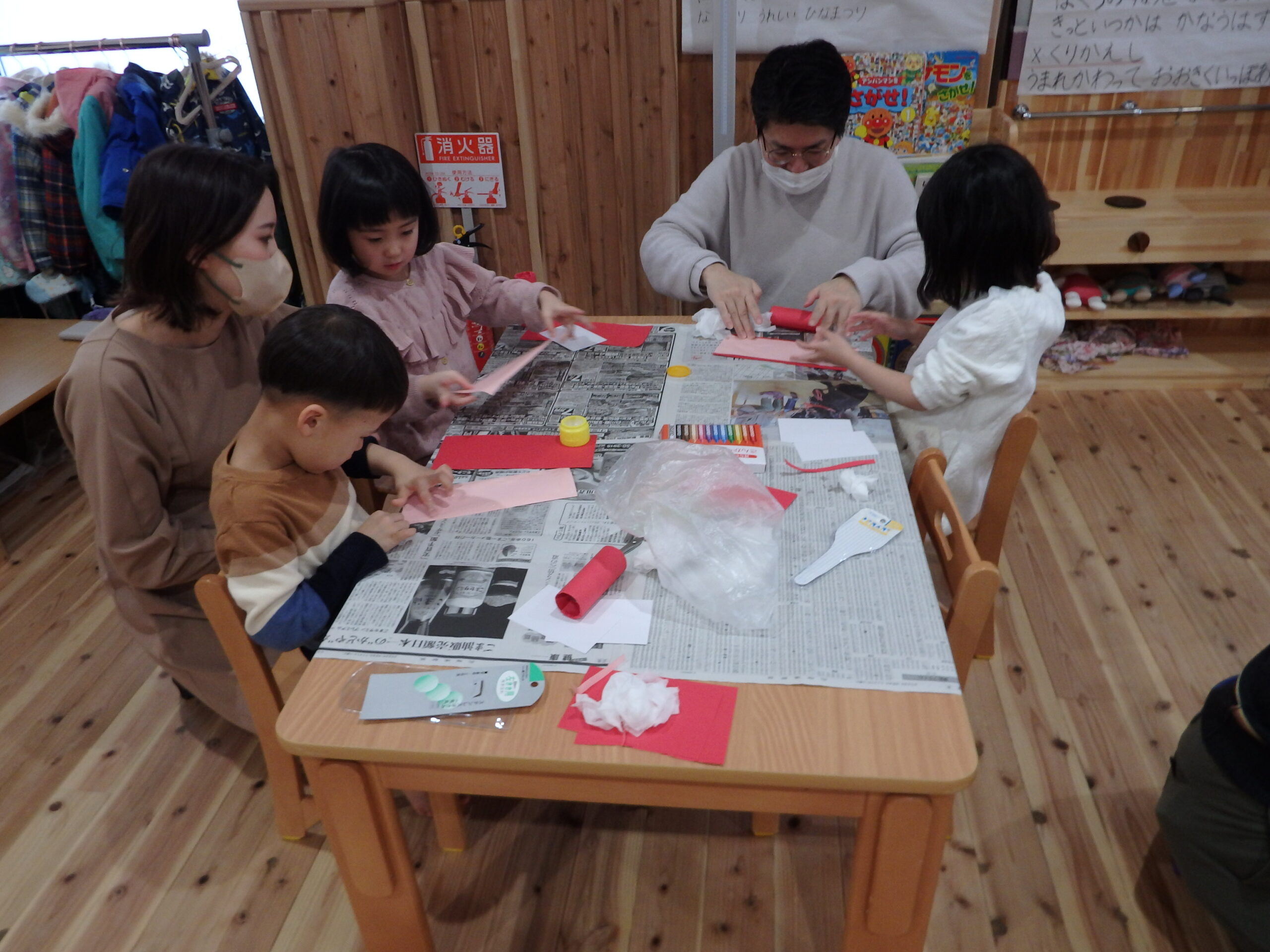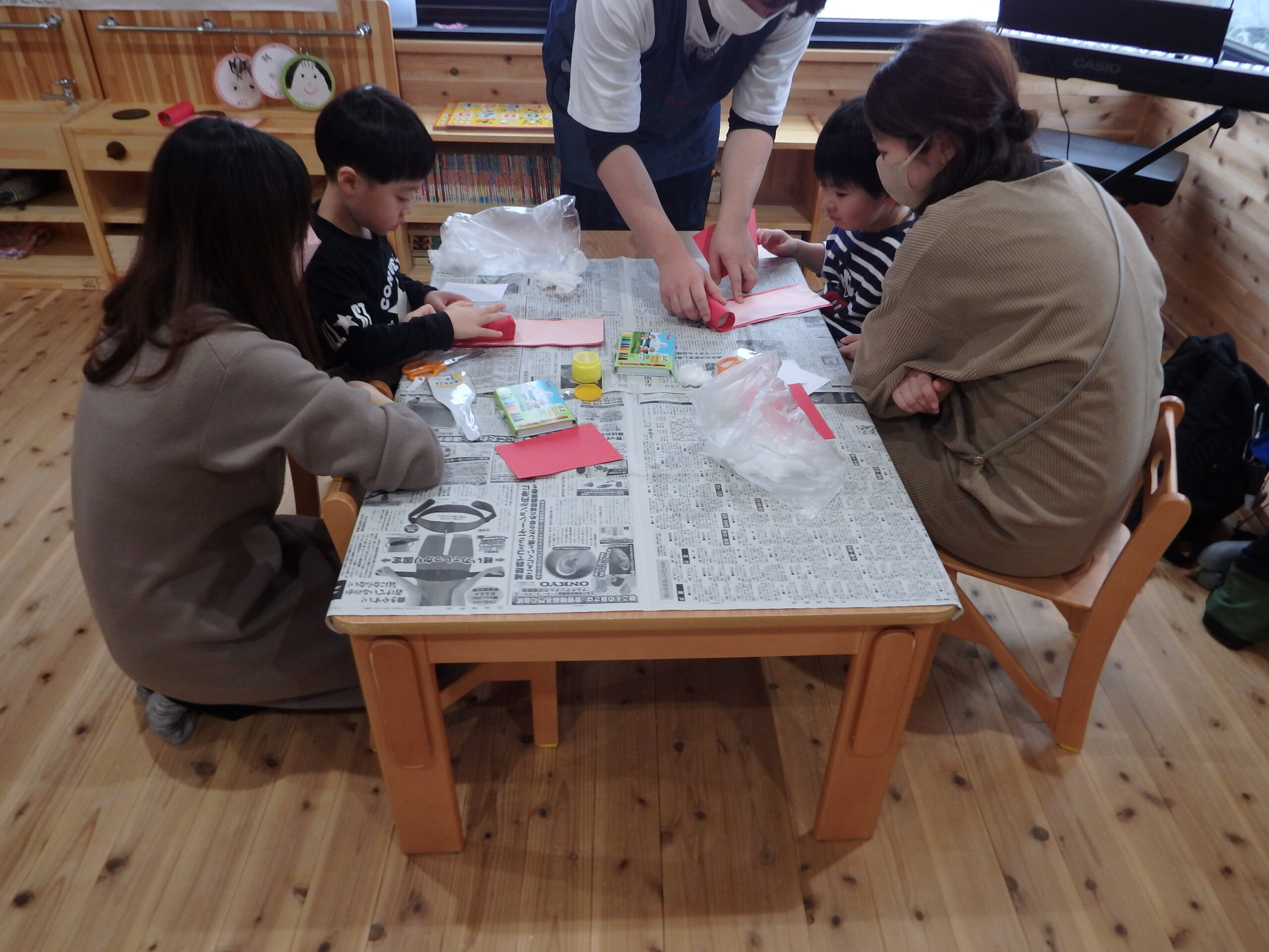 朝の会&“三びきのやぎのがらがらどん”の大型絵本を親子で楽しんでから・・ もうすぐ桃の節句なので、ひな祭り製作をしました! みんな真剣に取り組んでいましたよ!