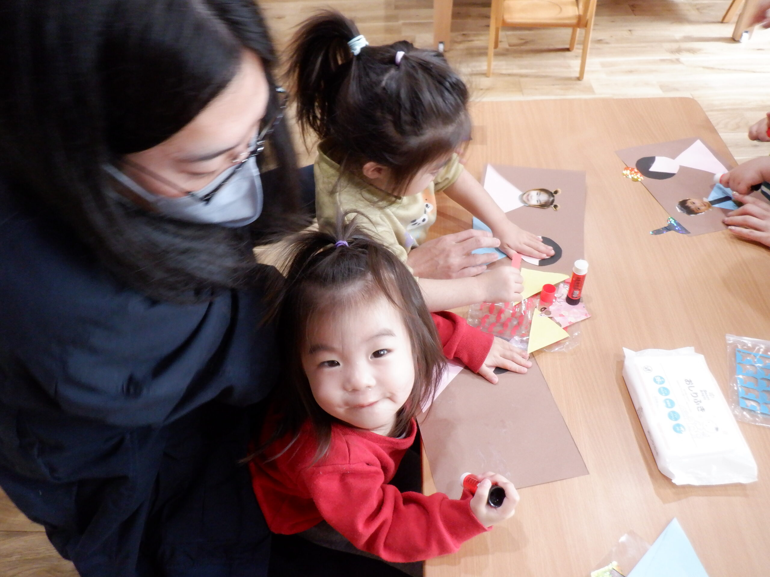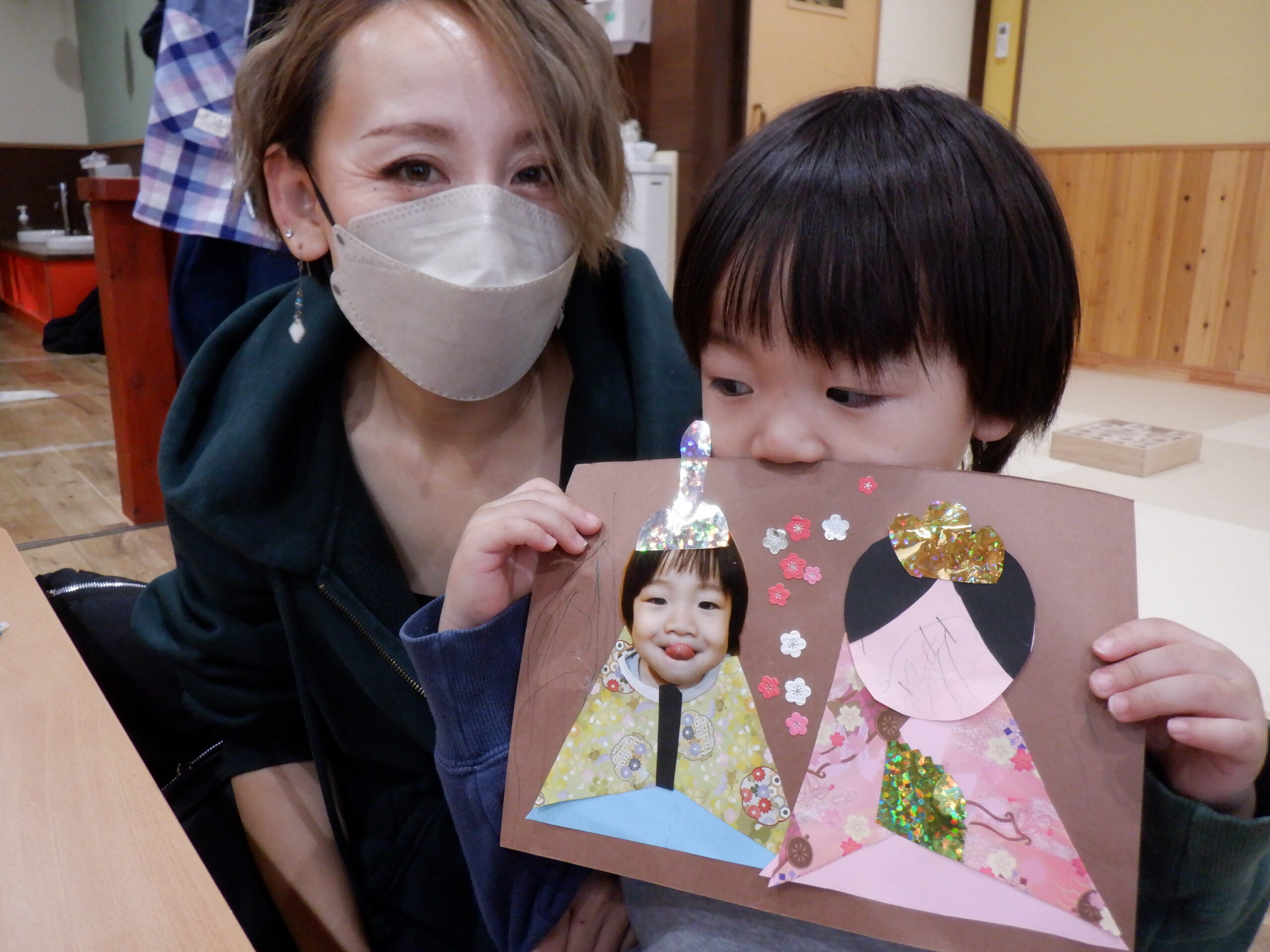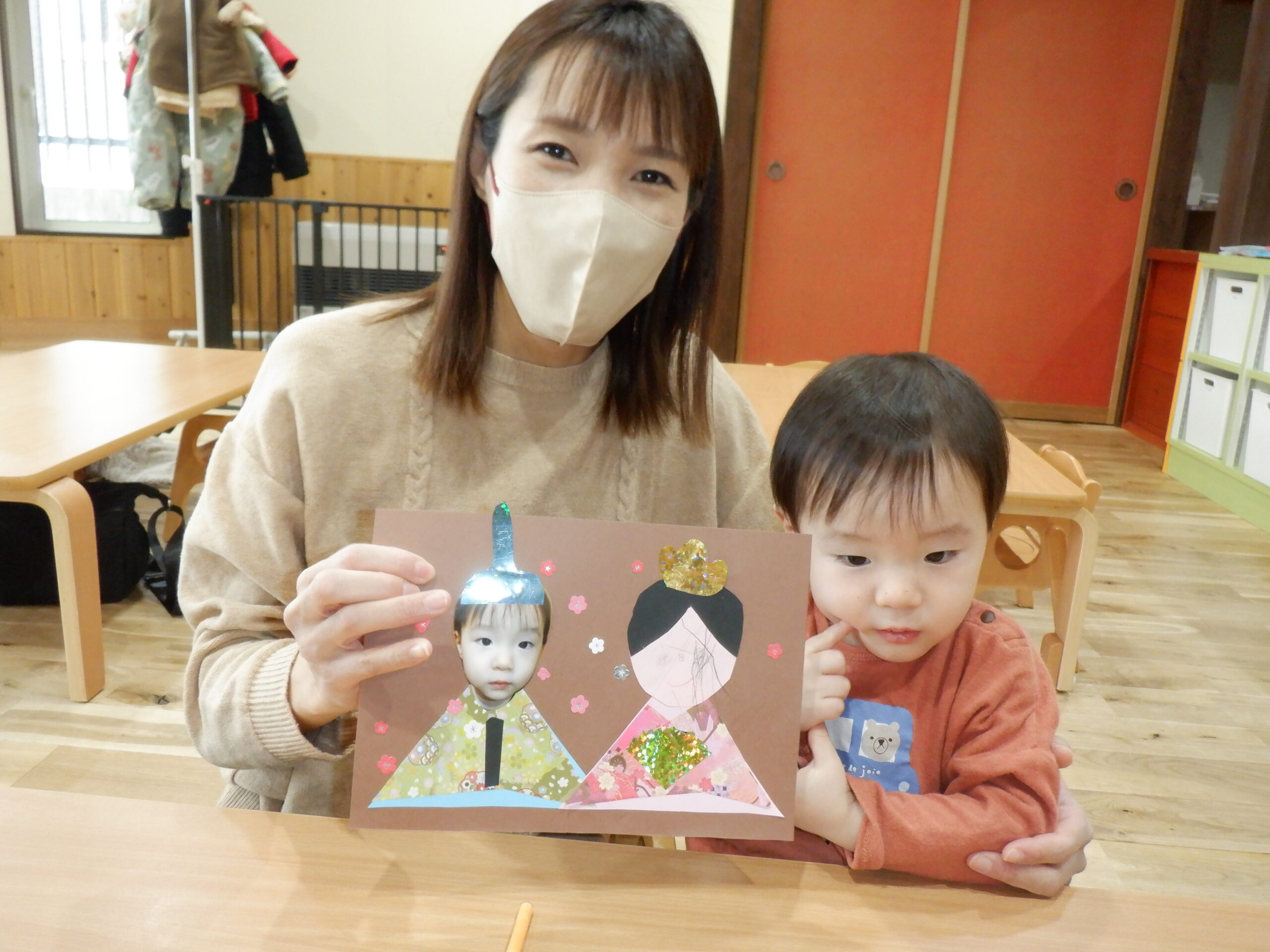お父さん・お母さんと一緒に楽しんで作っていましたよ♪ どこに、何を貼るのか相談したり、 お雛様とお内裏様の顔をどんな顔にするのか盛り上がっていました。