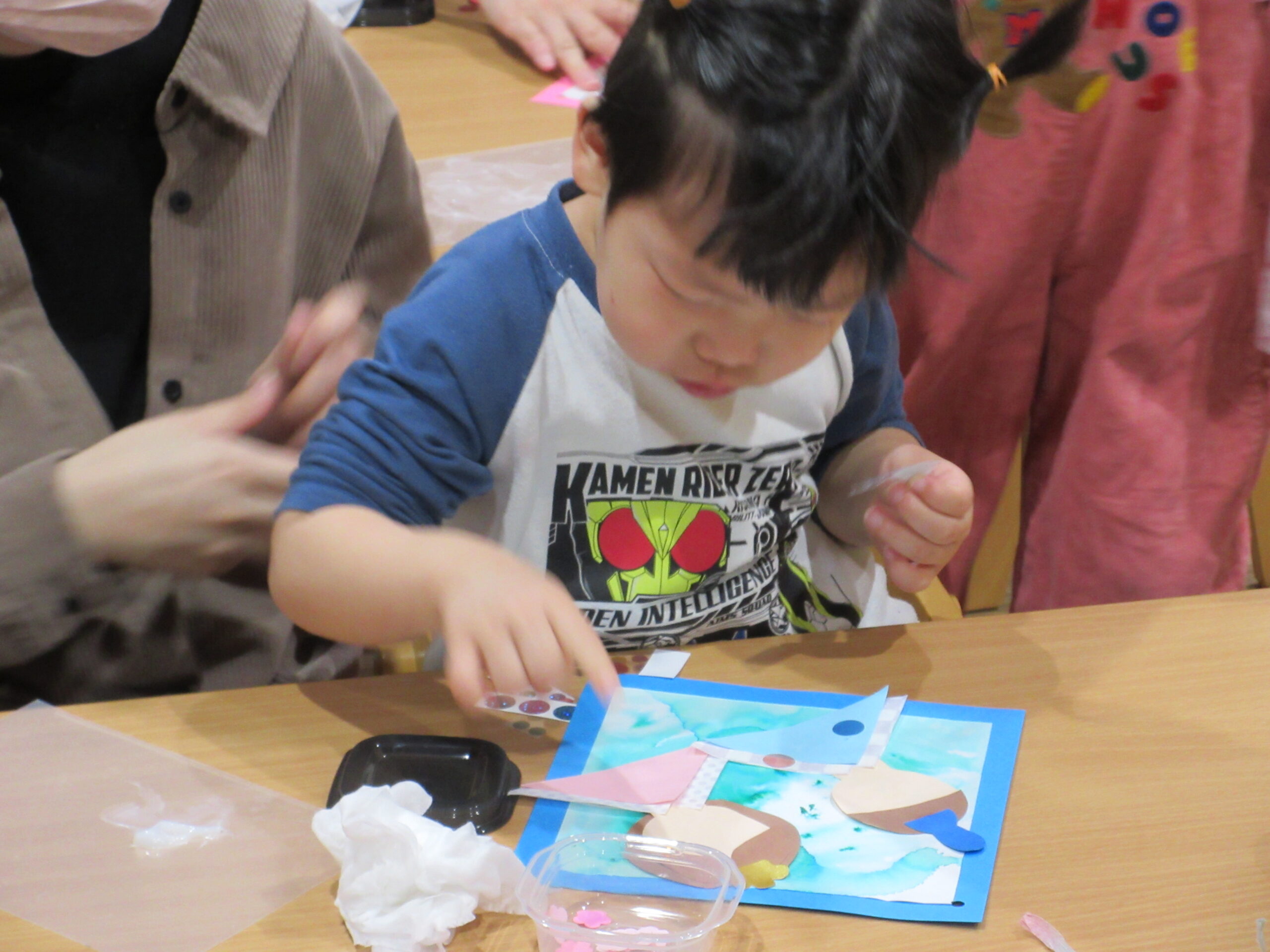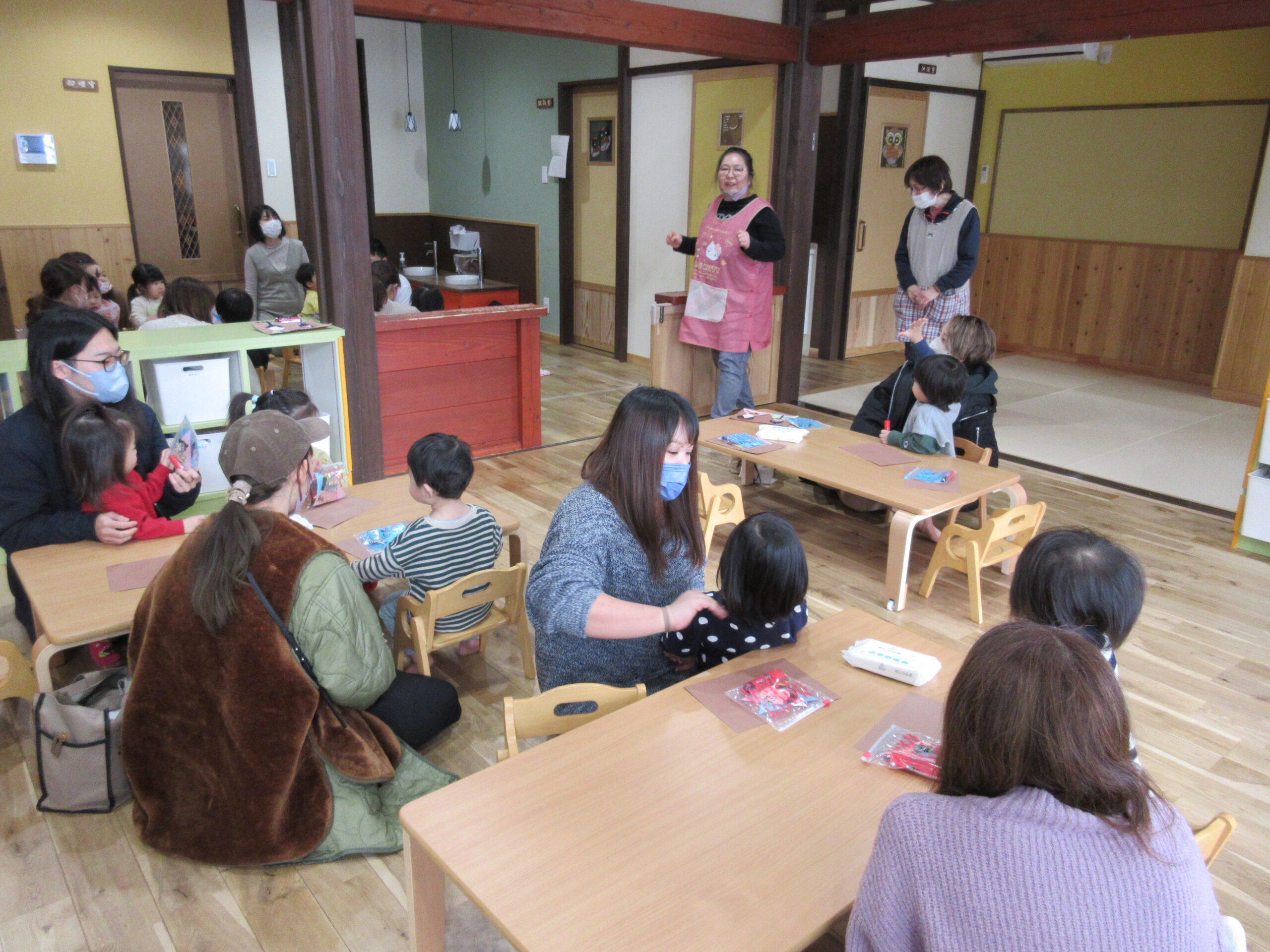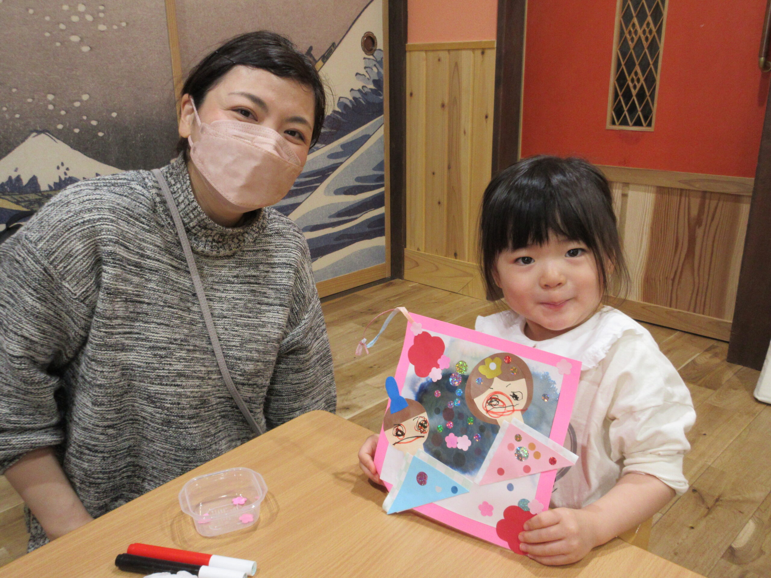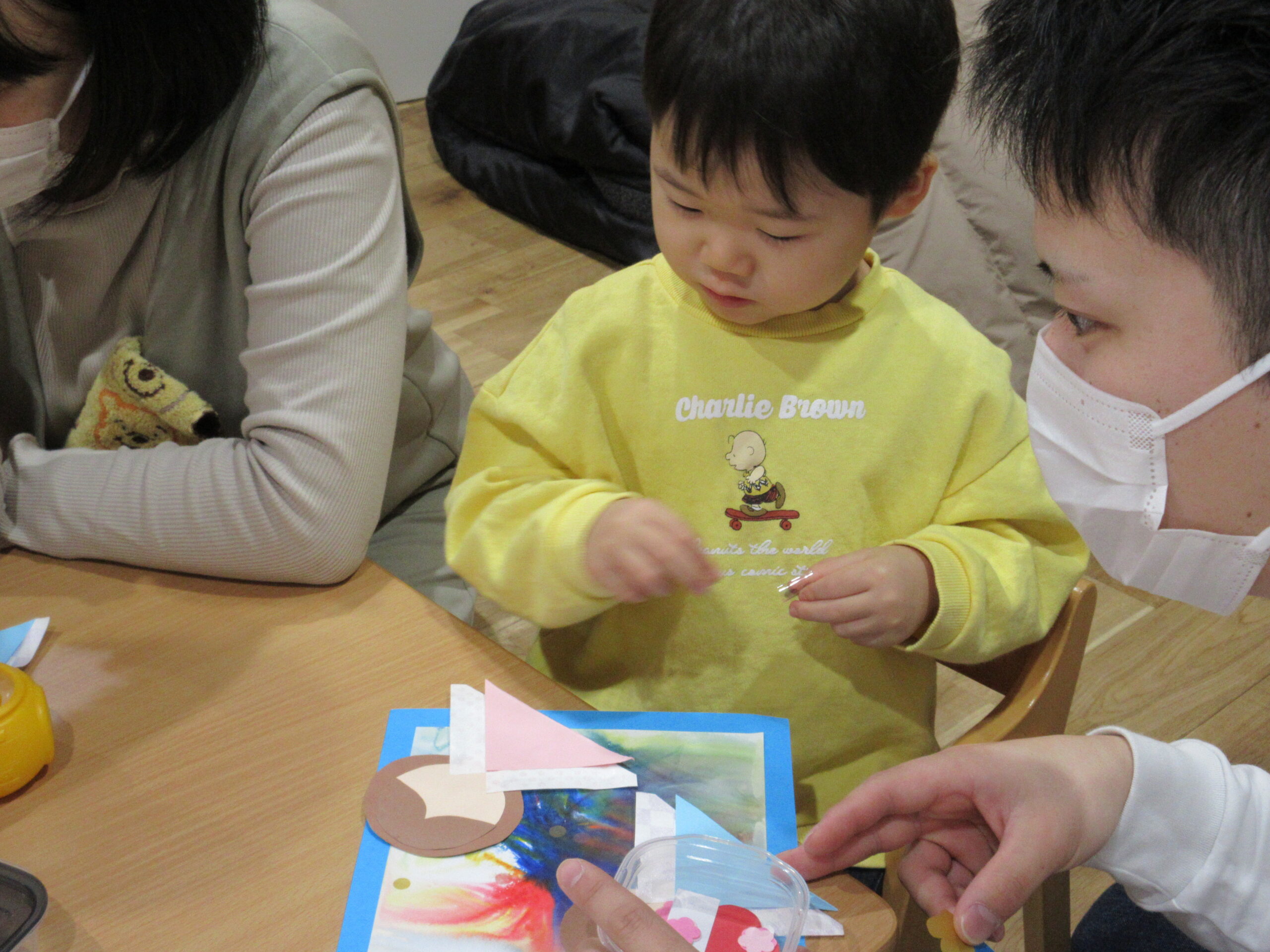 お父さん・お母さんと一緒に楽しんで作っていましたよ♪ どこに、何を貼るのか相談したり、 お雛様とお内裏様の顔をどんな顔にするのか盛り上がっていました。