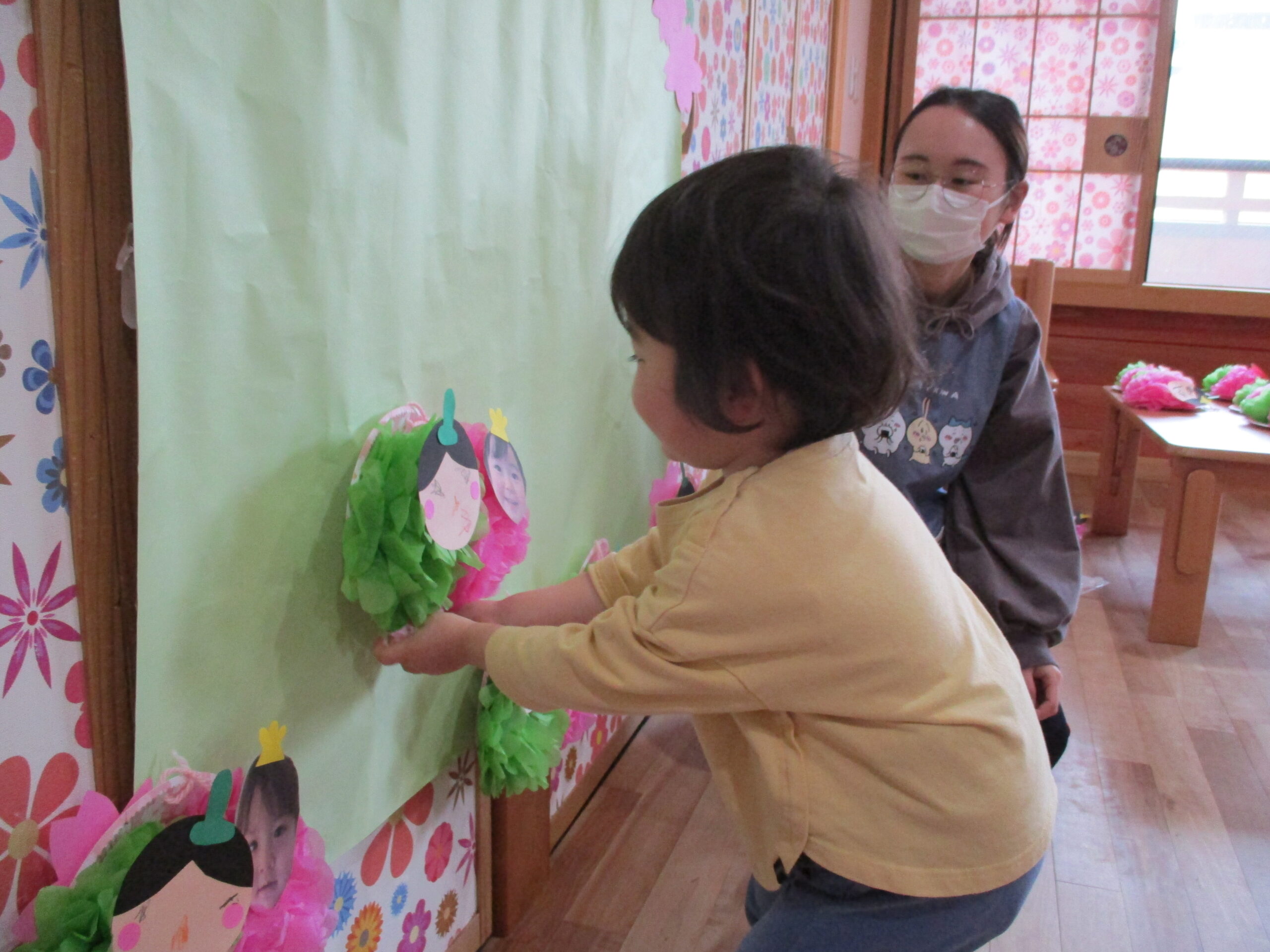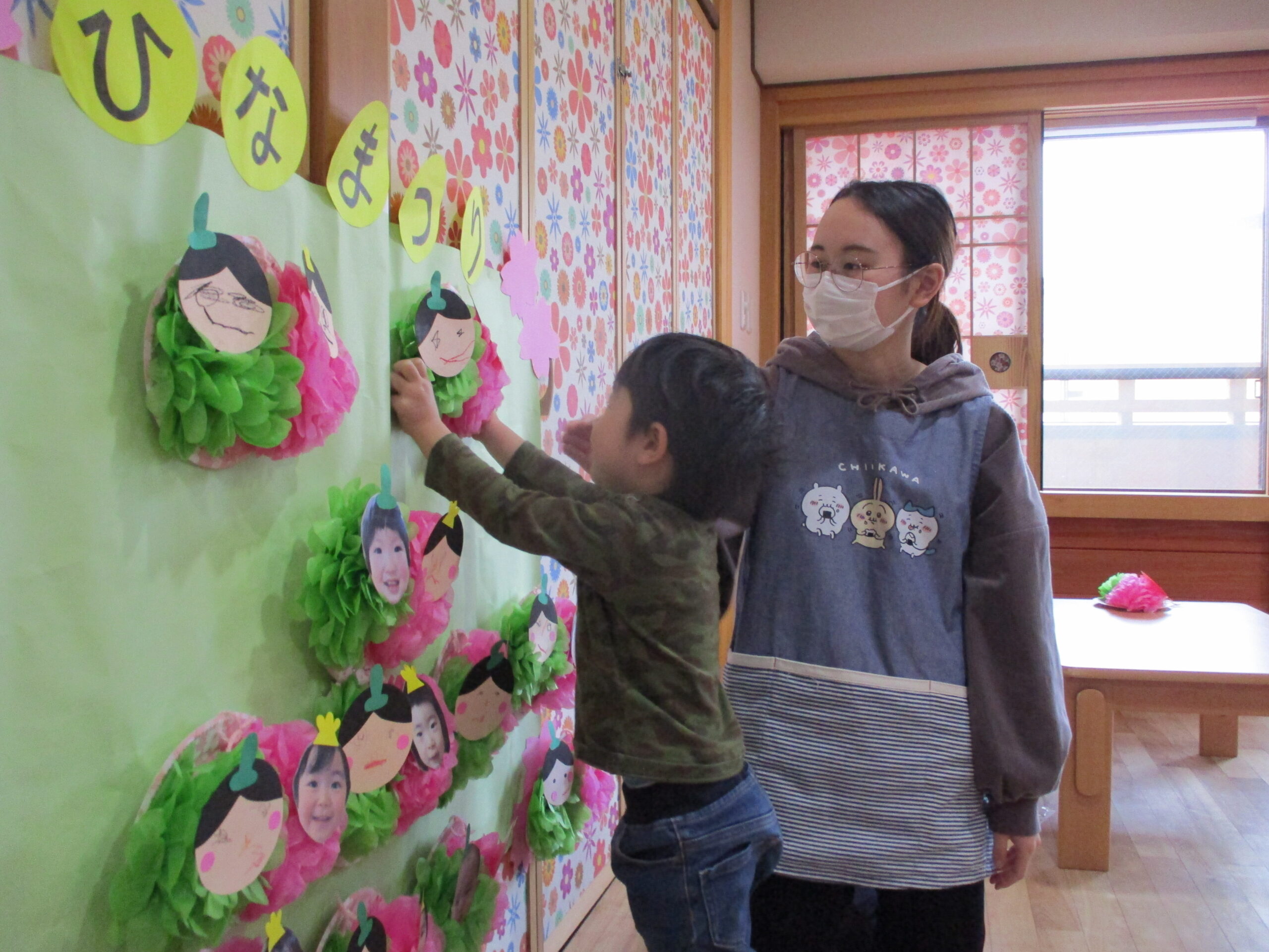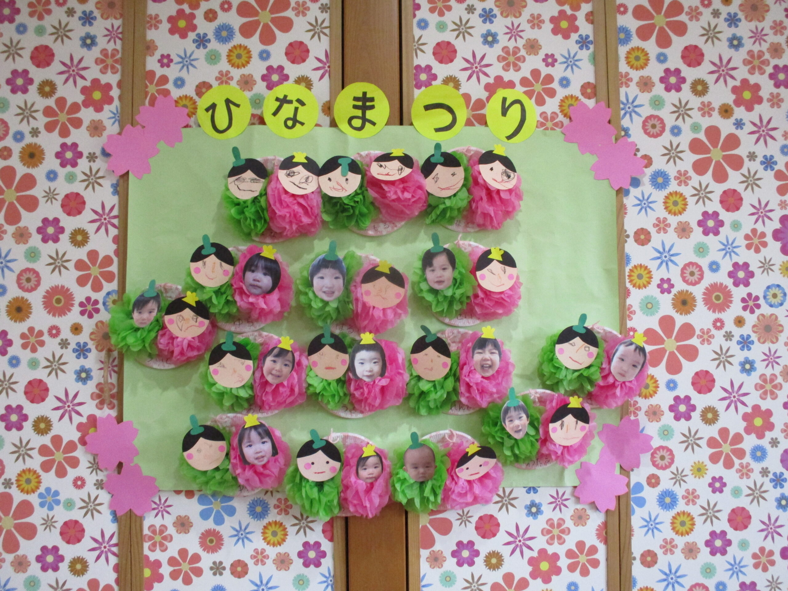 自分達で作ったひな人形を、自分達で可愛く貼りました。