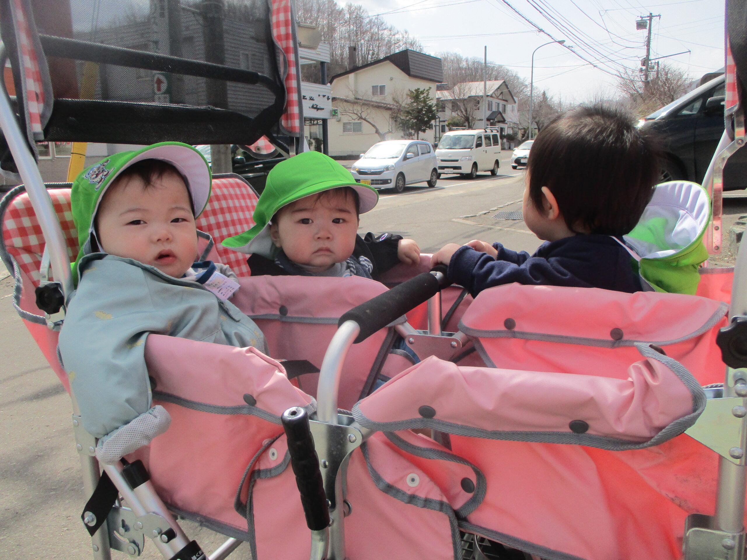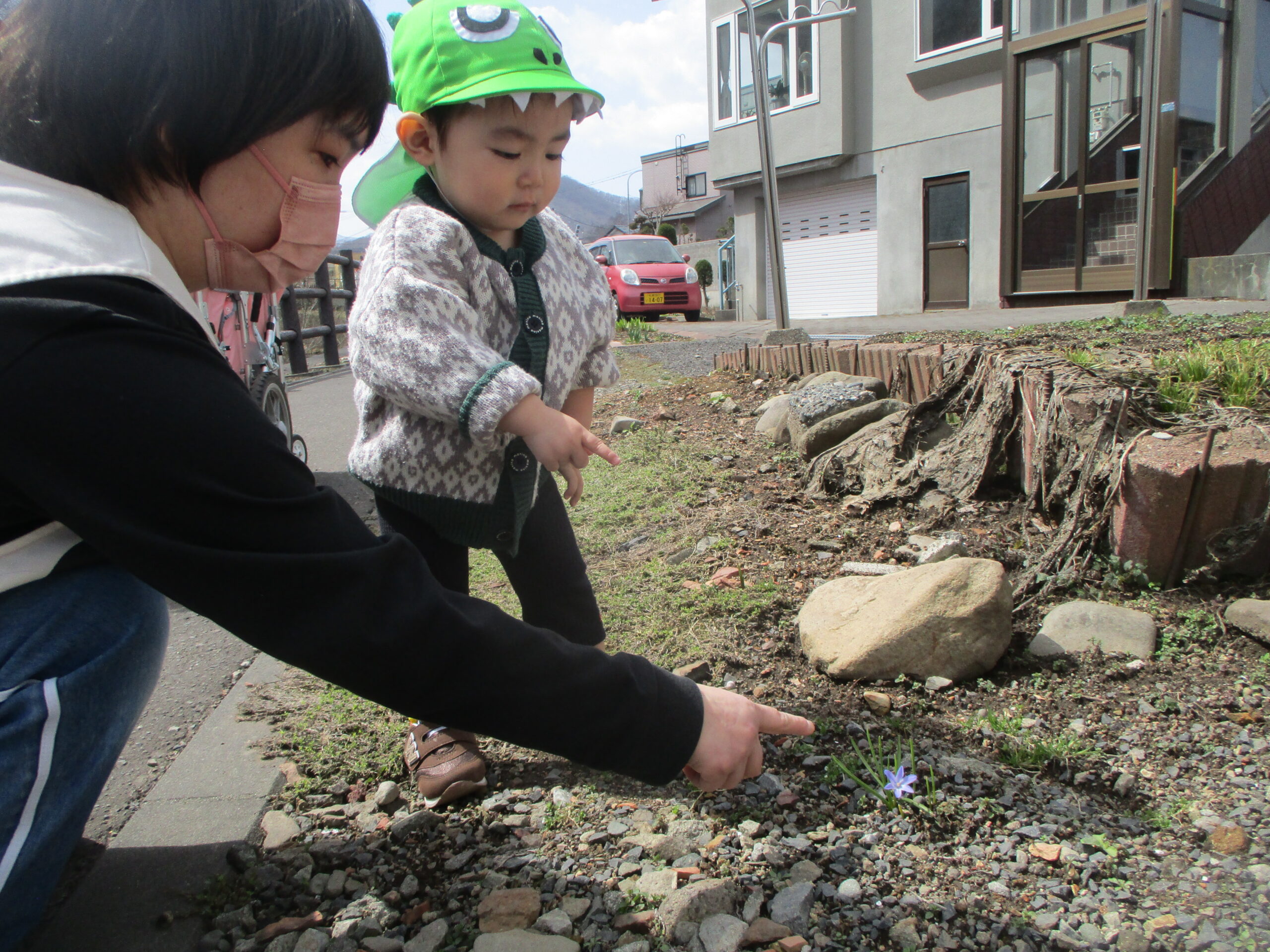 ~今年度、初めてどんぐり組さんと、くり組さんでお散歩に行ってきました!~ 風、気持ちいい!! お花、みつけたよ!