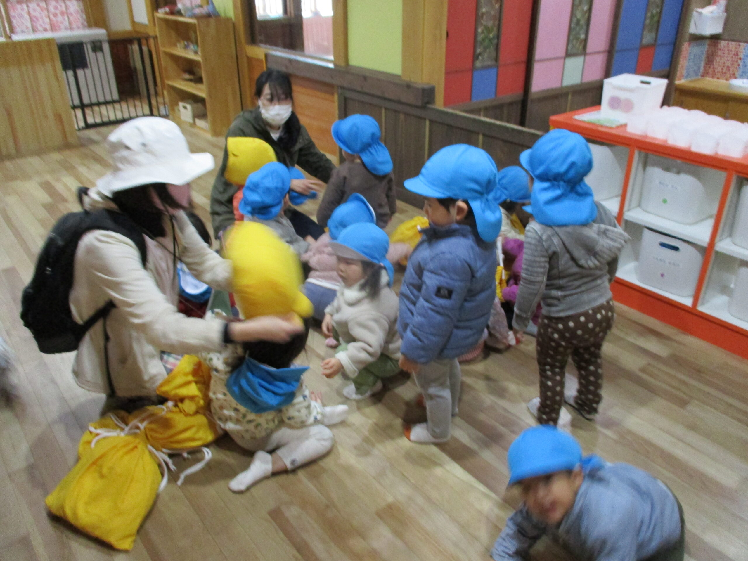 初めての防災頭巾も嫌がらず、しっかりとかぶってくれました。