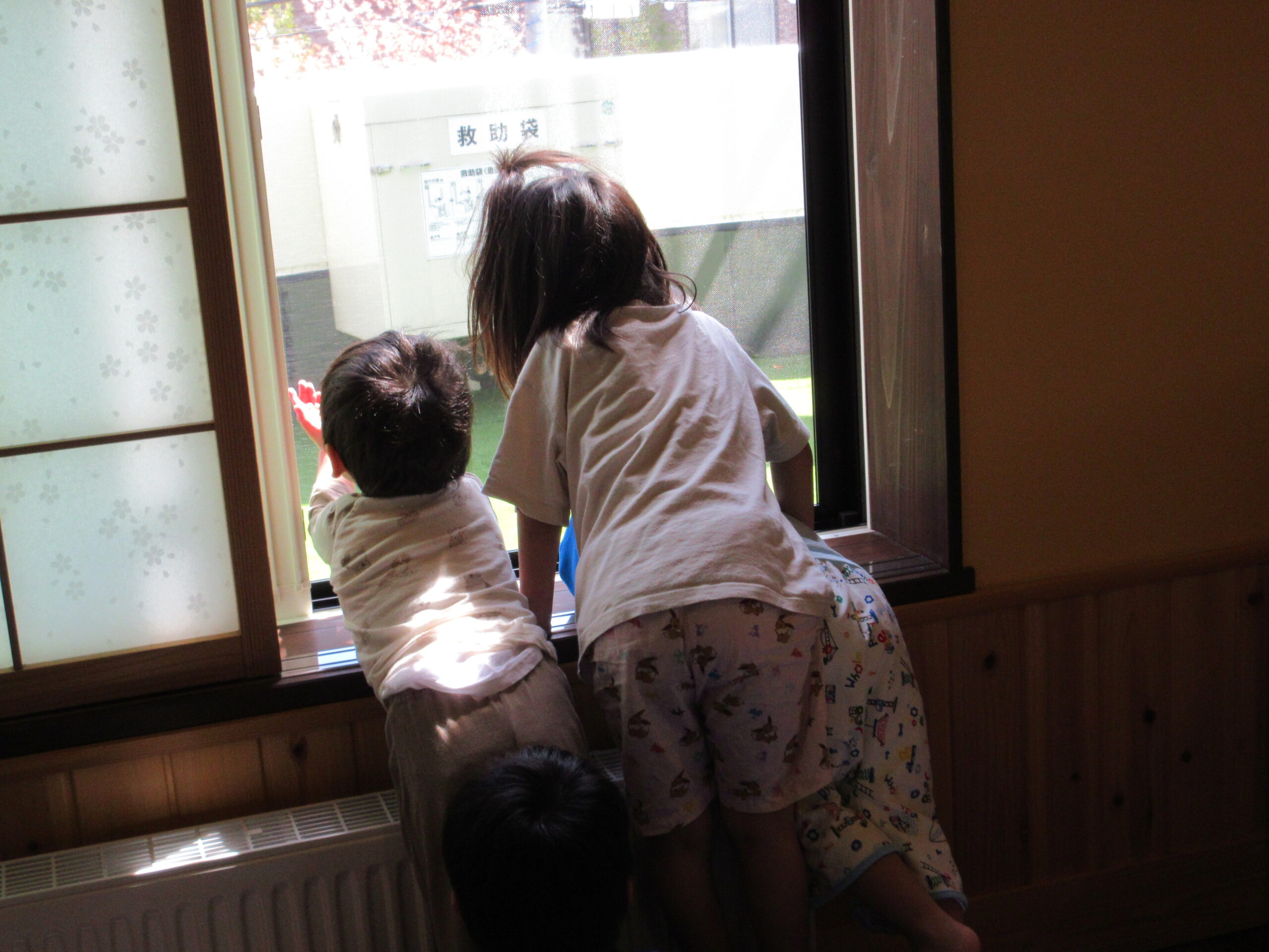 ポカポカ陽気にウキウキしながら窓の外を眺めた子ども達が 「あっ!!」と声を上げました。