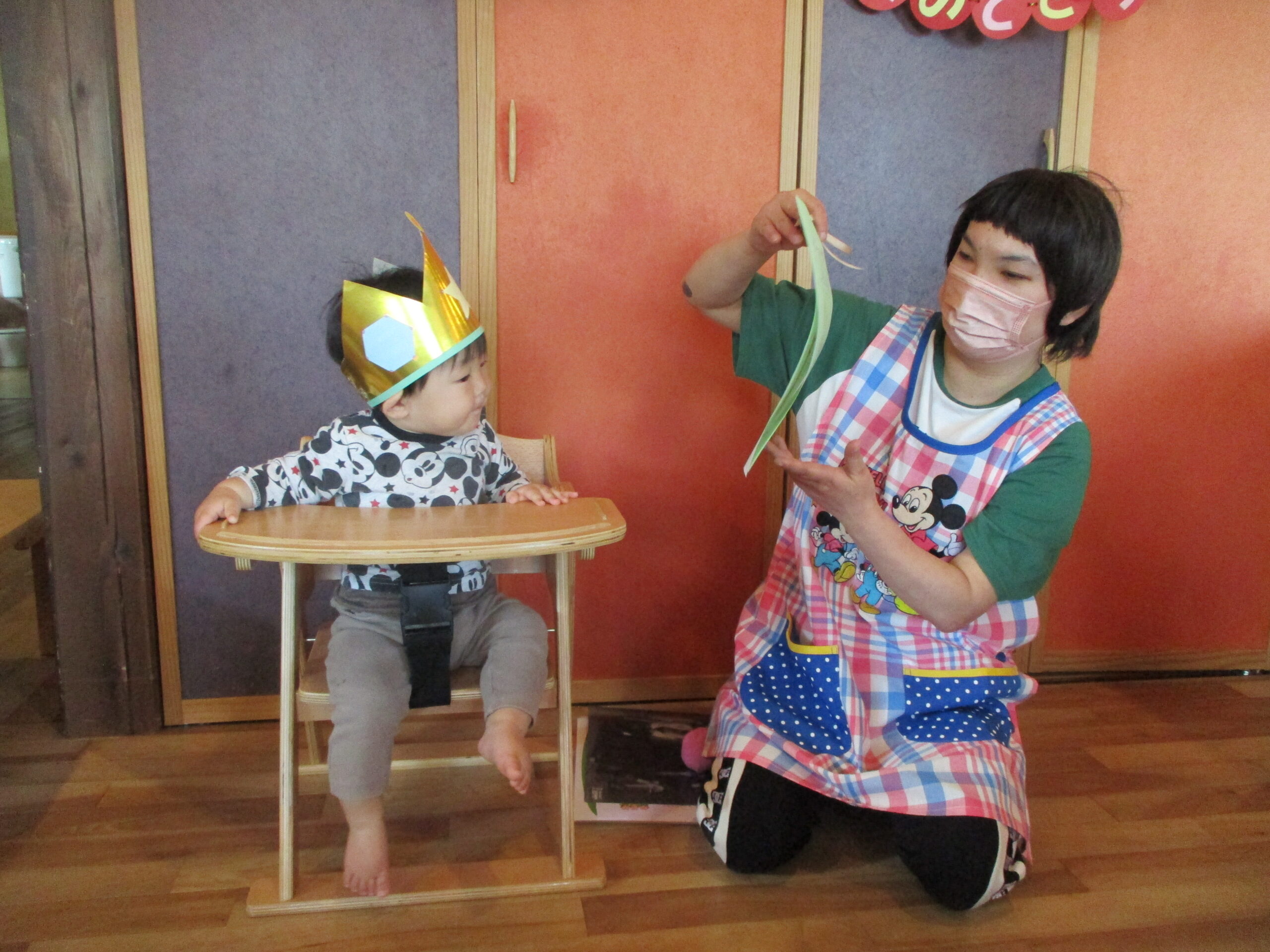 今日はお誕生日会をしました!2名の予定でしたがお休みだったので1名のお誕生児でした。冠を被ると「にこっ」と笑顔が見られ、誕生日カードを渡すと興味津々に受け取っていました♪
