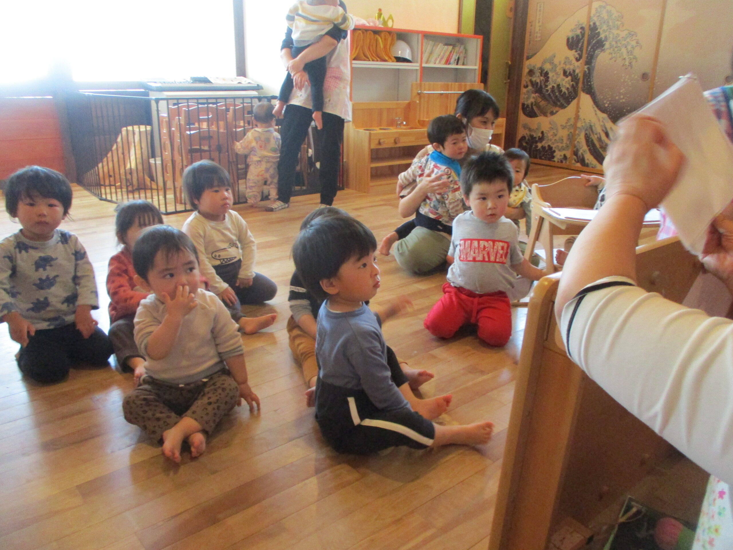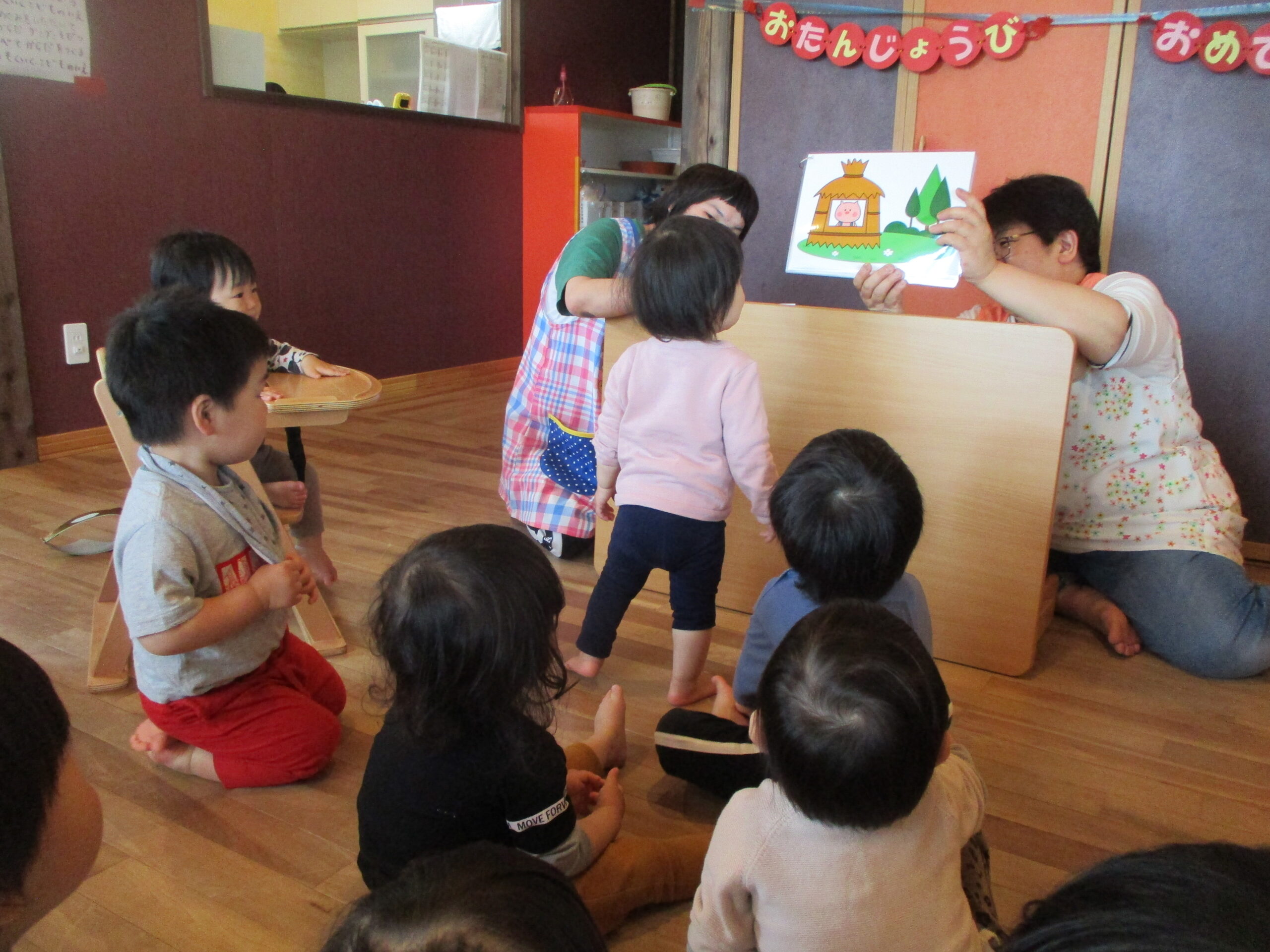 保育士の出し物「3びきのこぶた」では、動く仕掛けを不思議そうに見ていた子ども達でした。